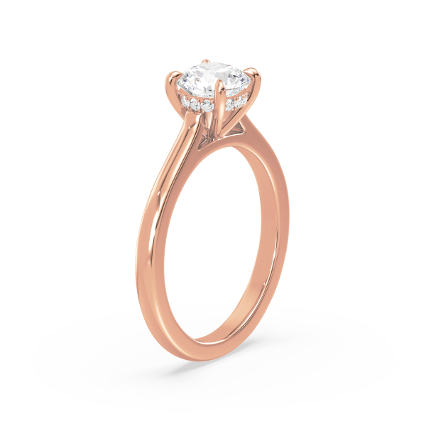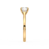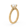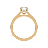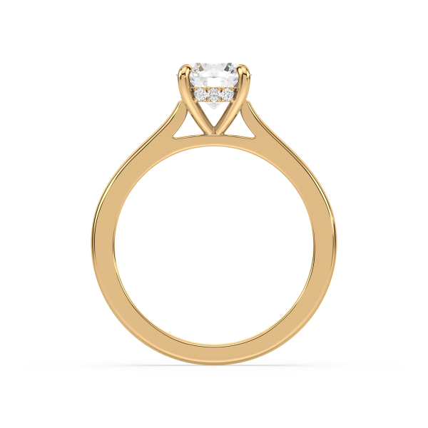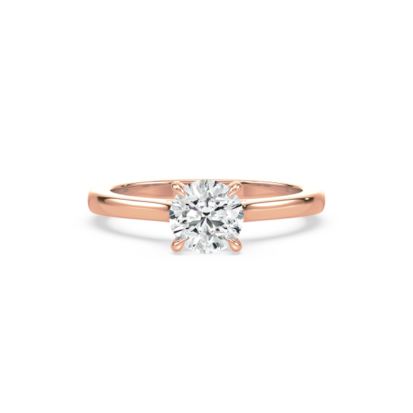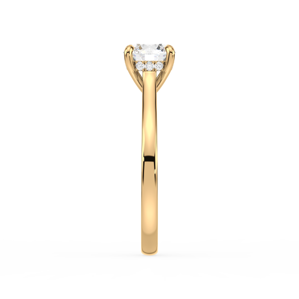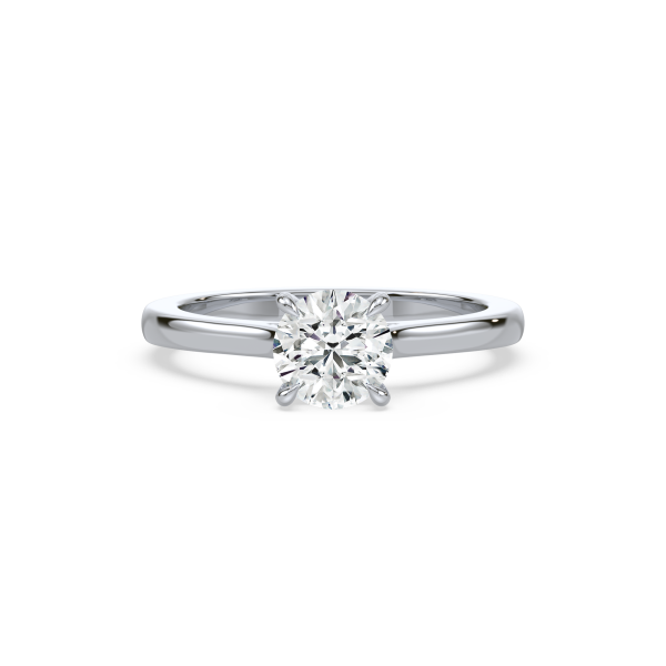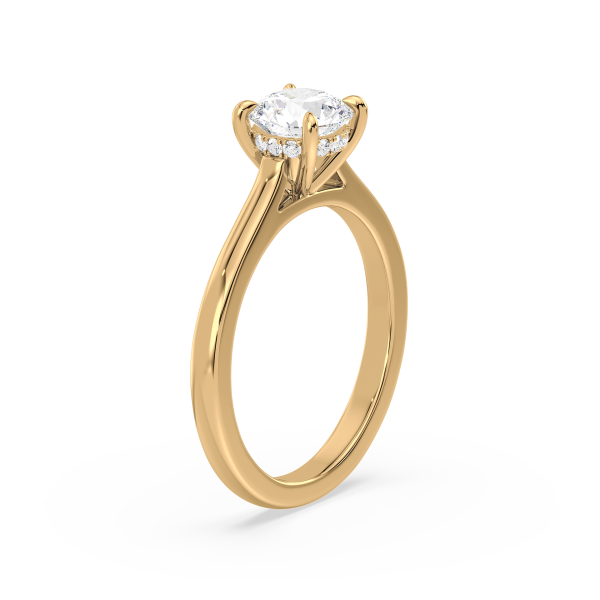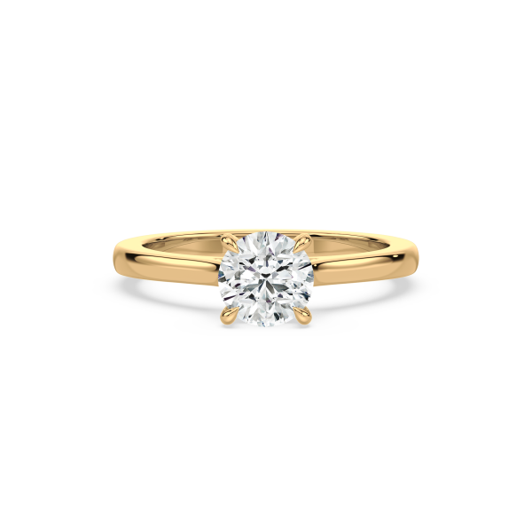 A refined solitaire engagement ring showcasing a brilliant round lab-grown diamond held by a sleek four-prong setting. The polished gold band enhances the diamond’s fire and brilliance, creating a symbol of elegance and commitment that never goes out of style.