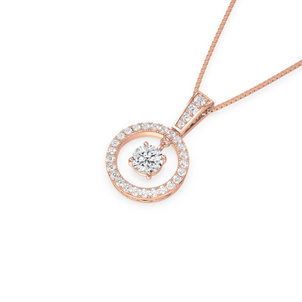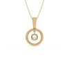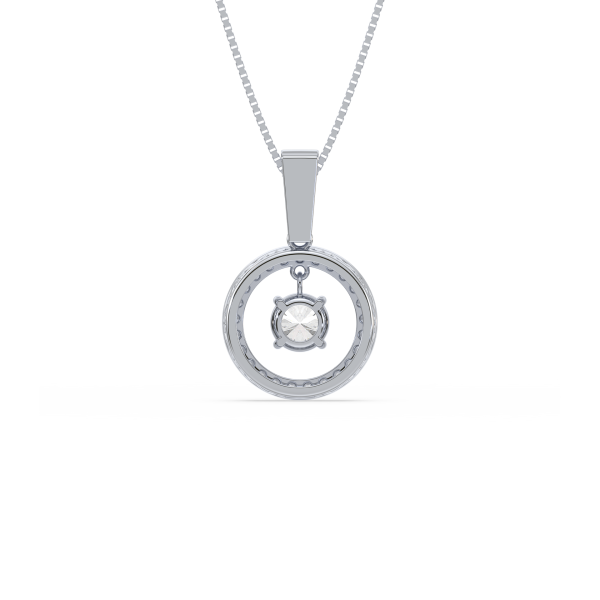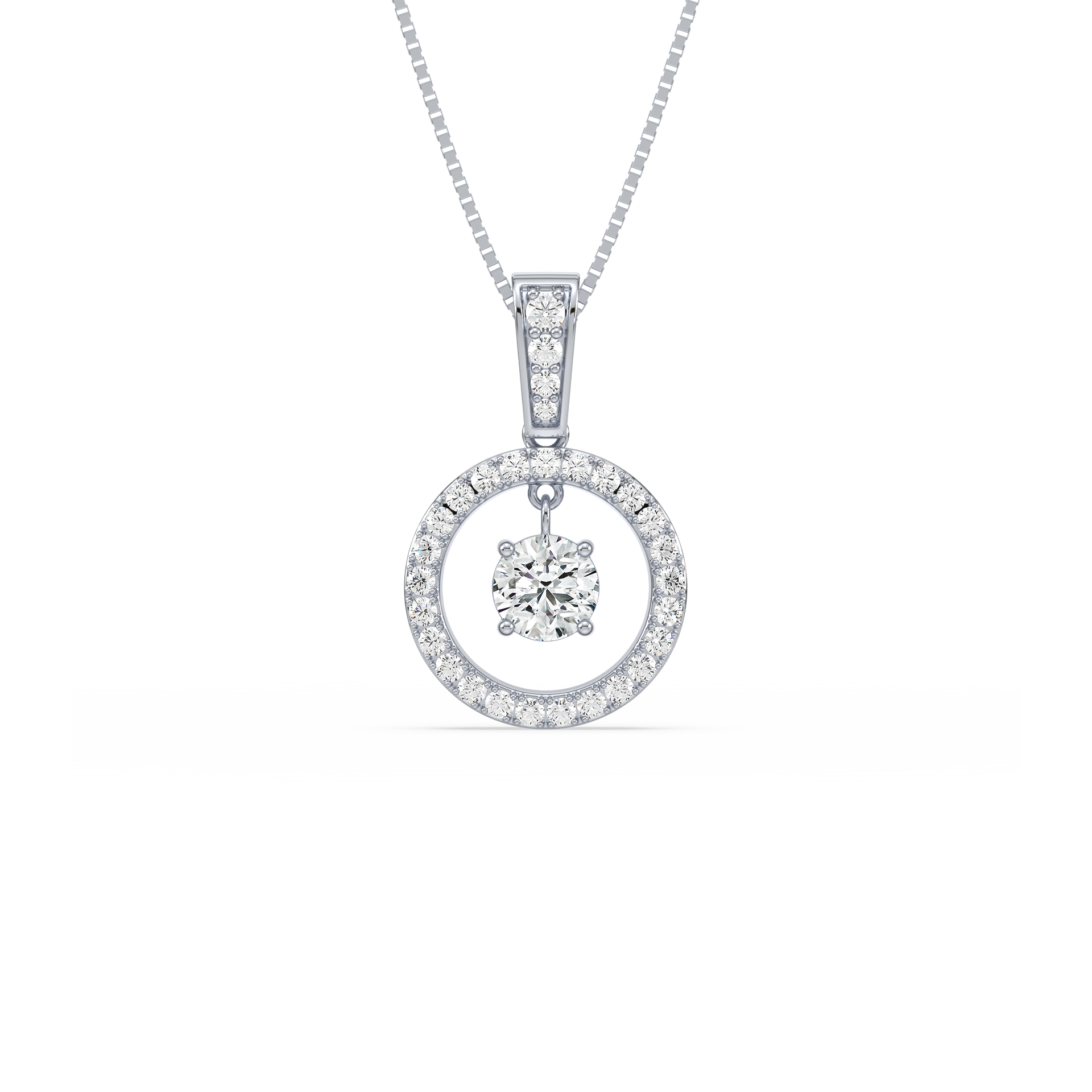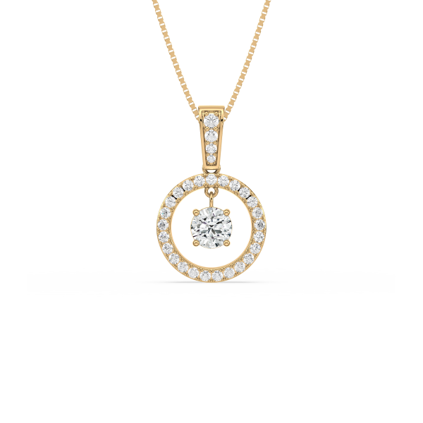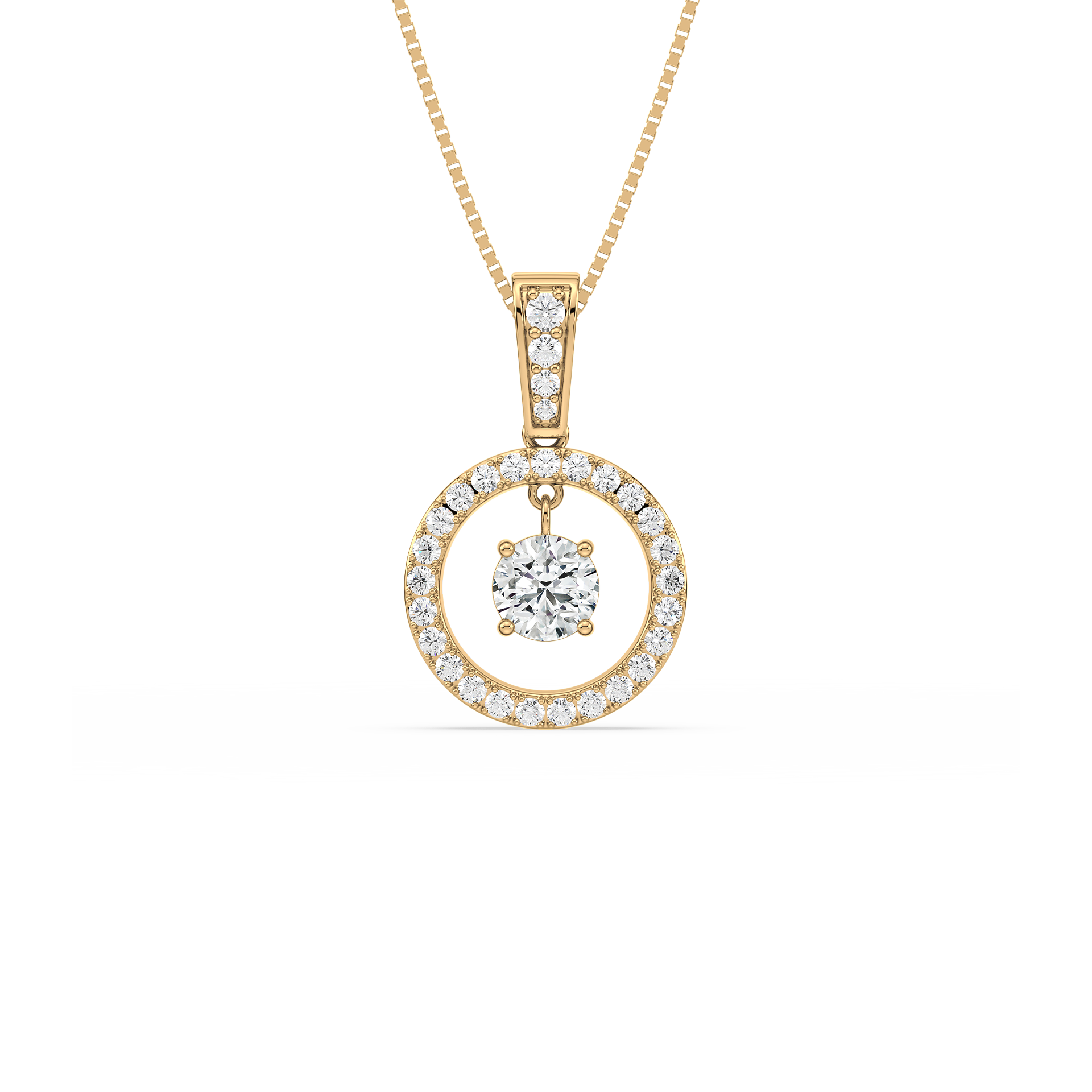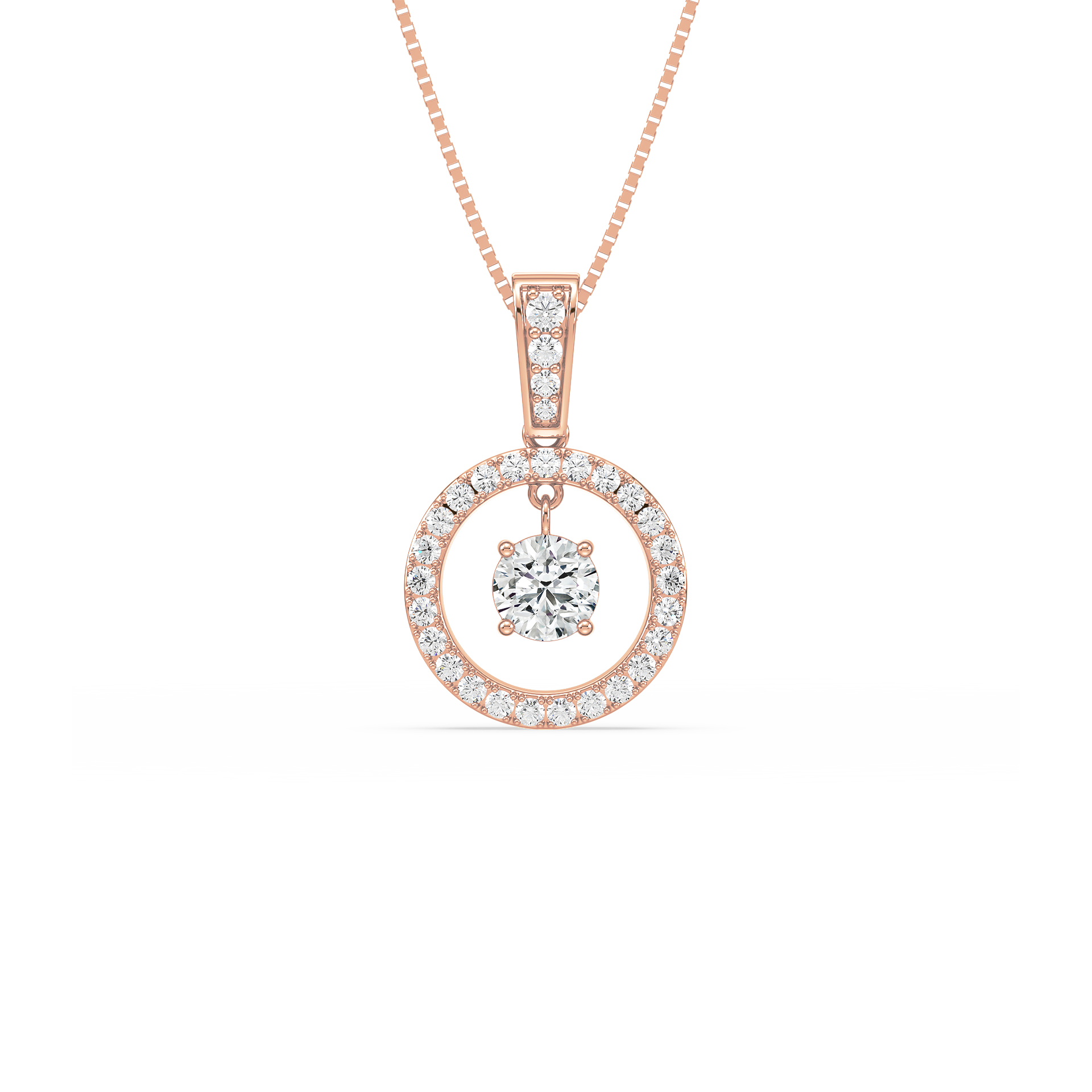 A radiant diamond circle pendant featuring a sparkling solitaire suspended at its center. Surrounded by a halo of brilliant diamonds, this design symbolizes eternity and elegance