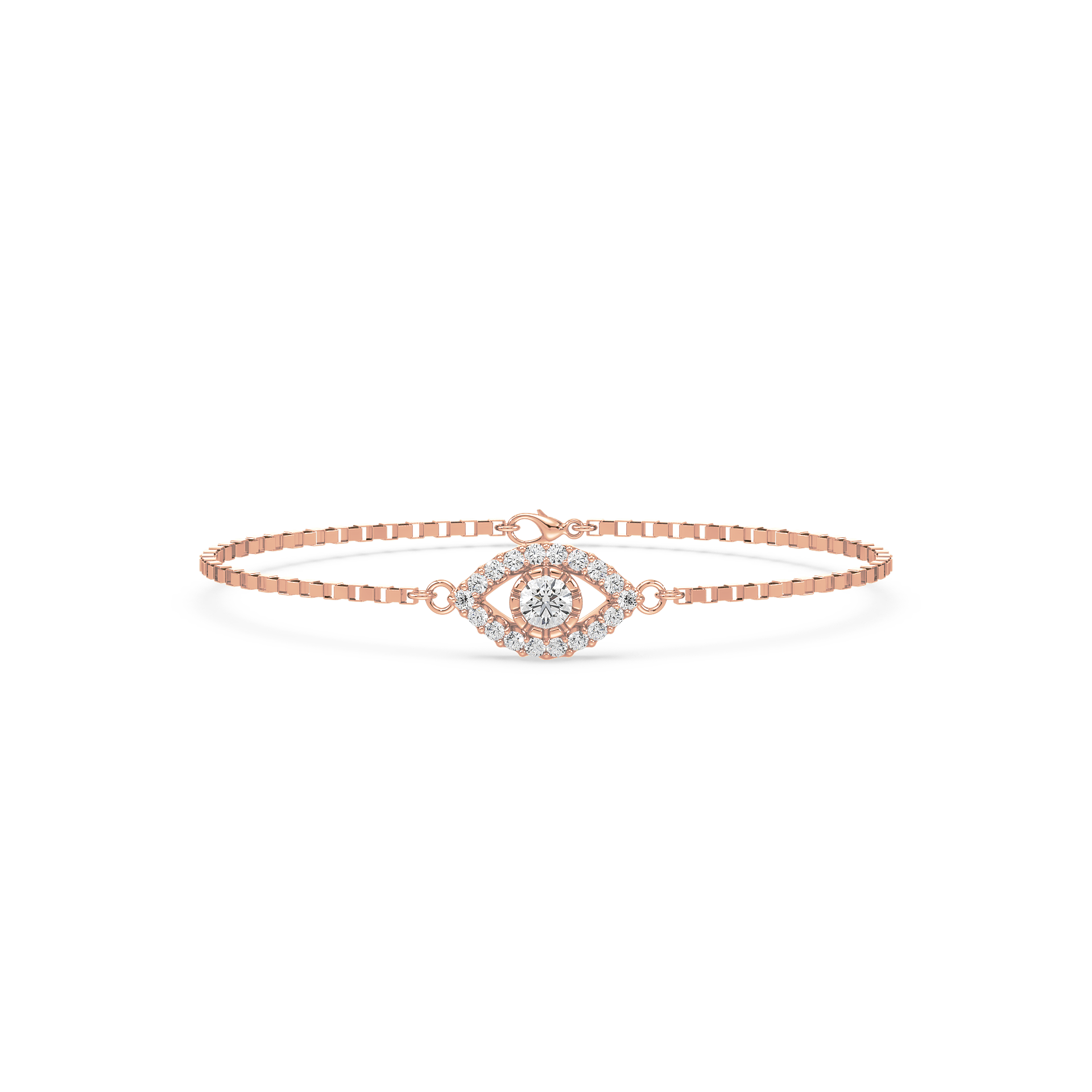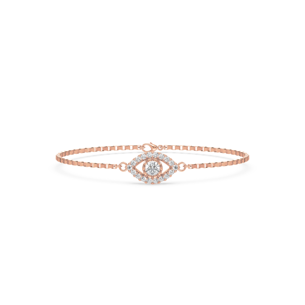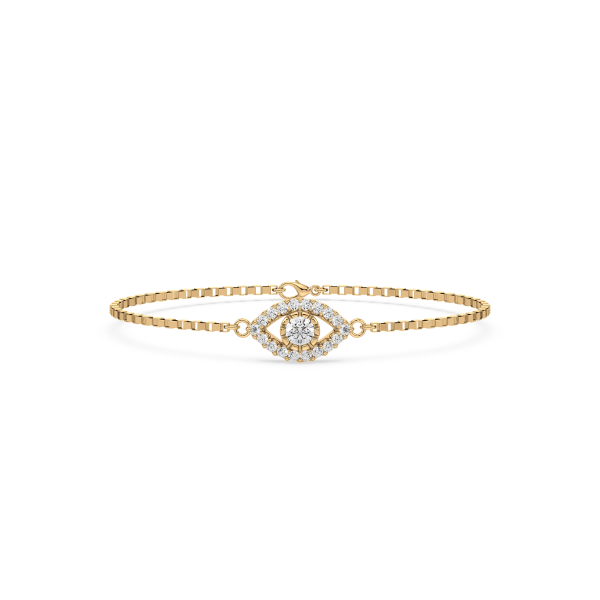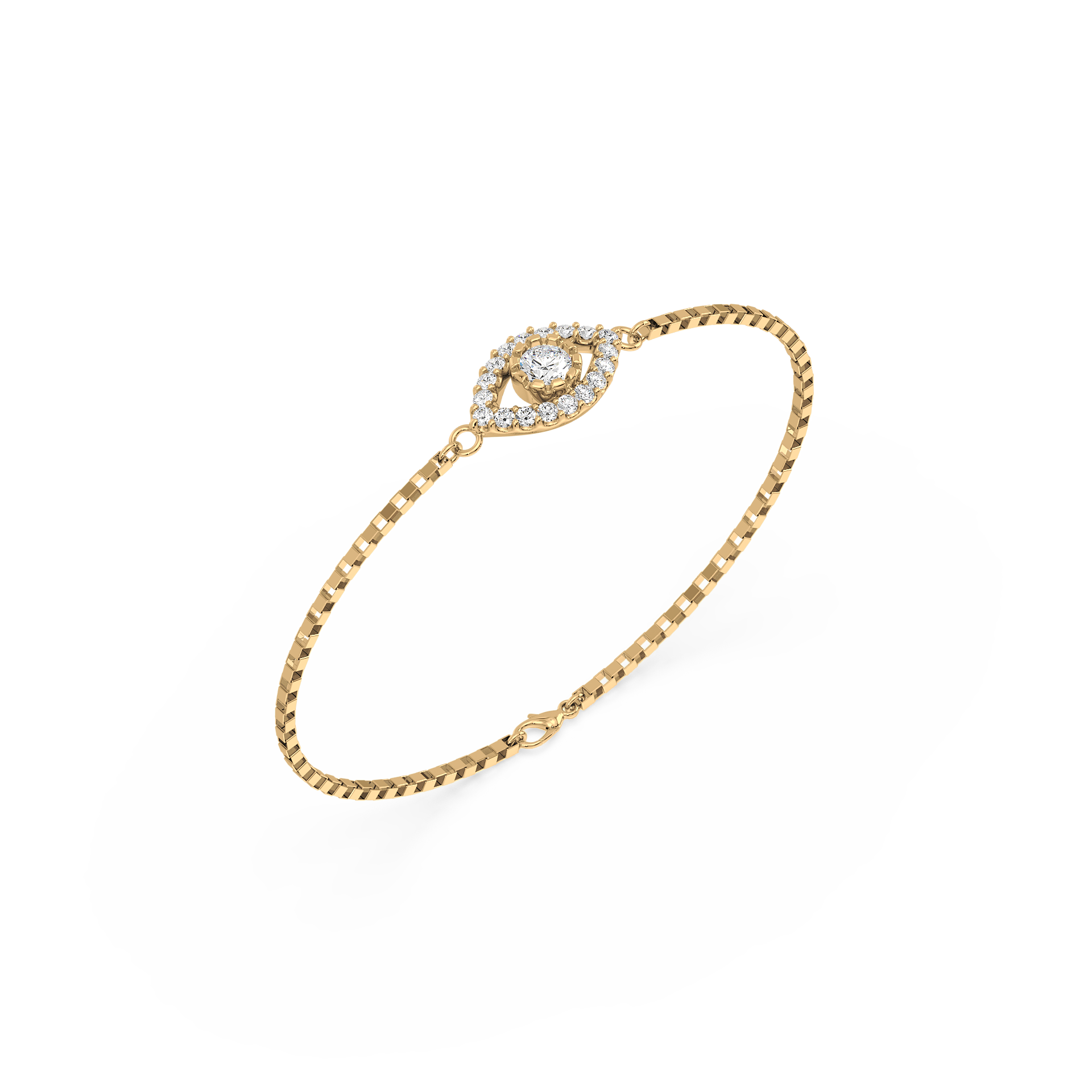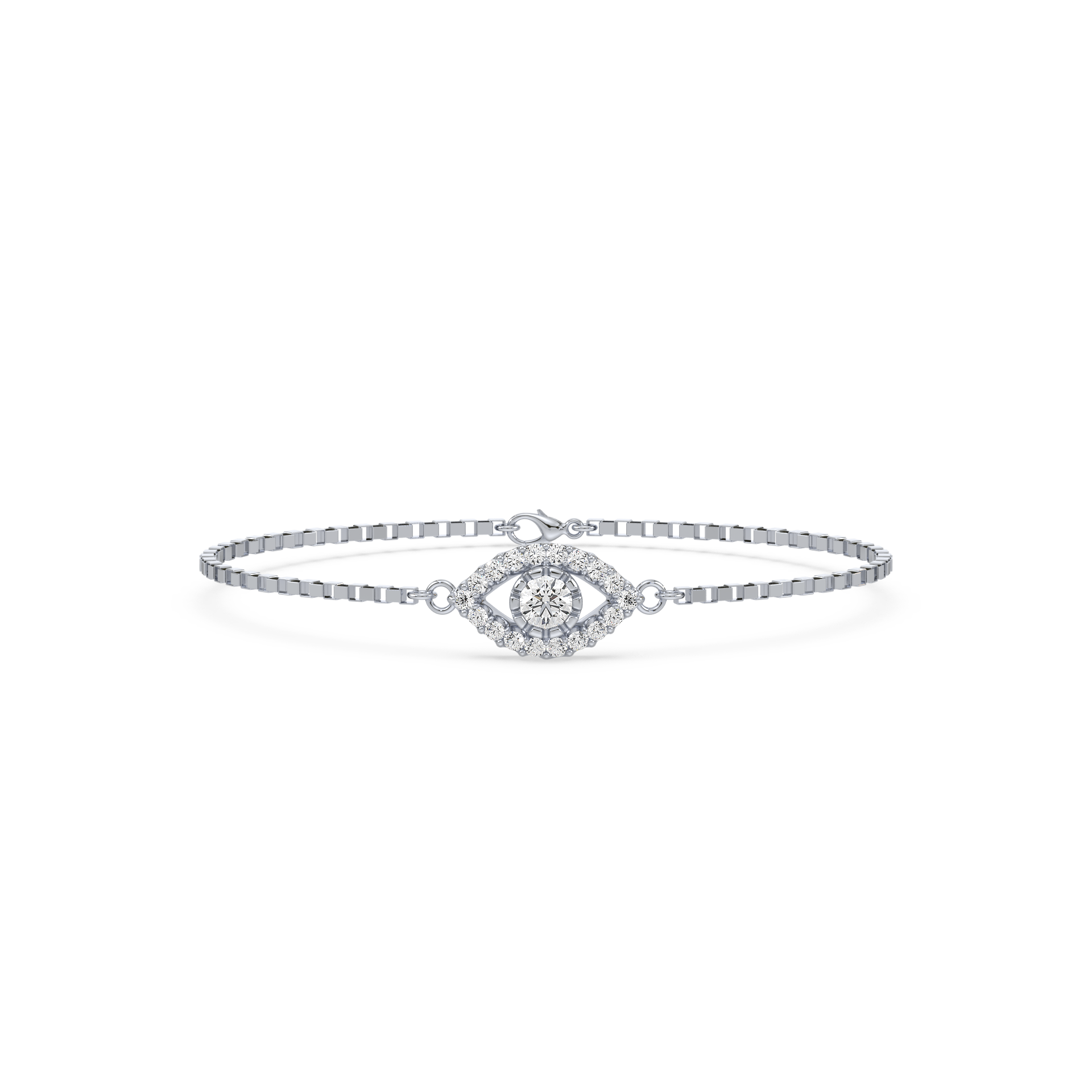 A refined bracelet featuring a dazzling diamond evil-eye motif, symbolizing protection and positivity. Its sleek design combines elegance with meaningful charm, making it both fashionable and spiritual.