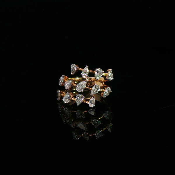 This glamorous diamond ring for women features multiple gold bands crowned with pear-shaped diamond-style clusters for a rich, layered look.