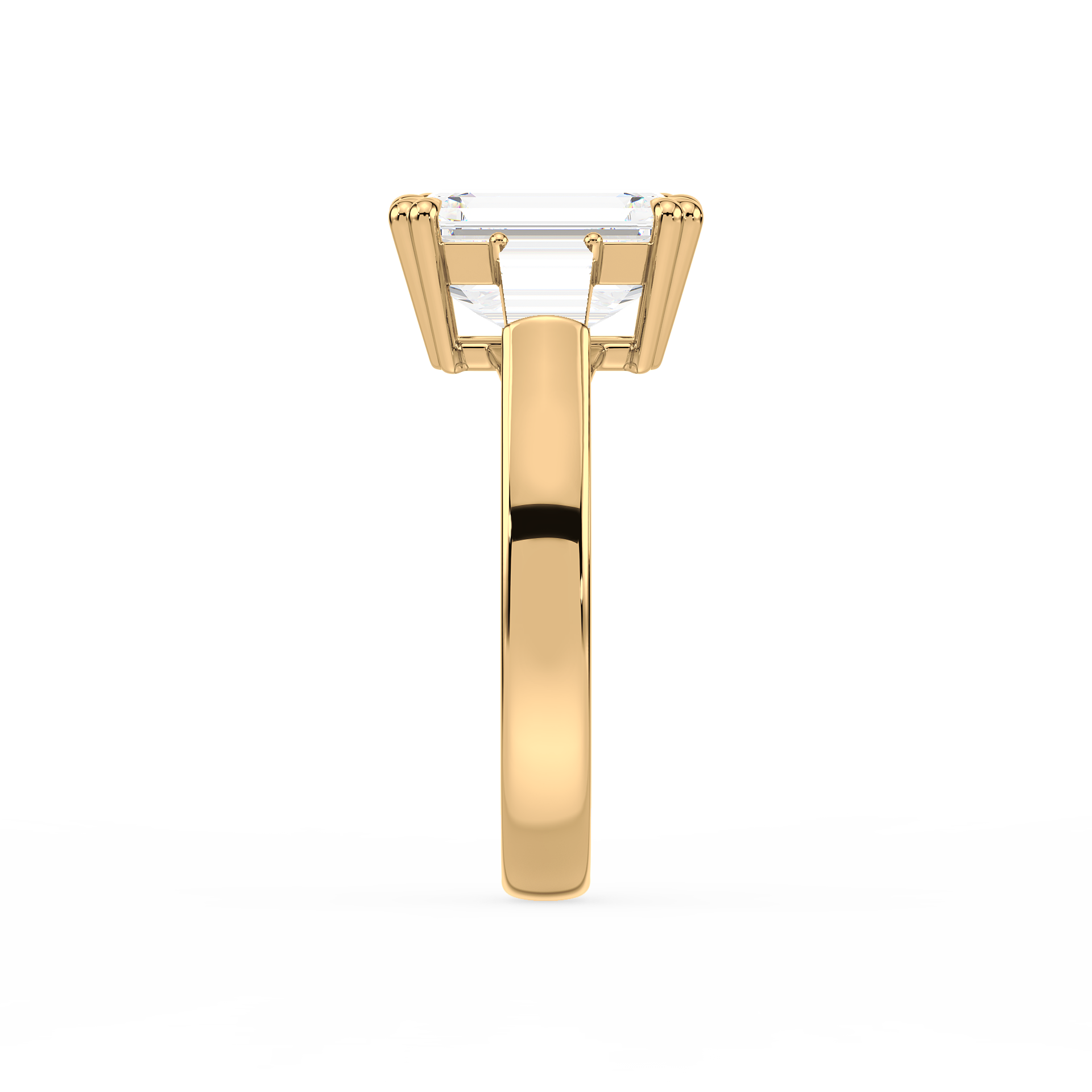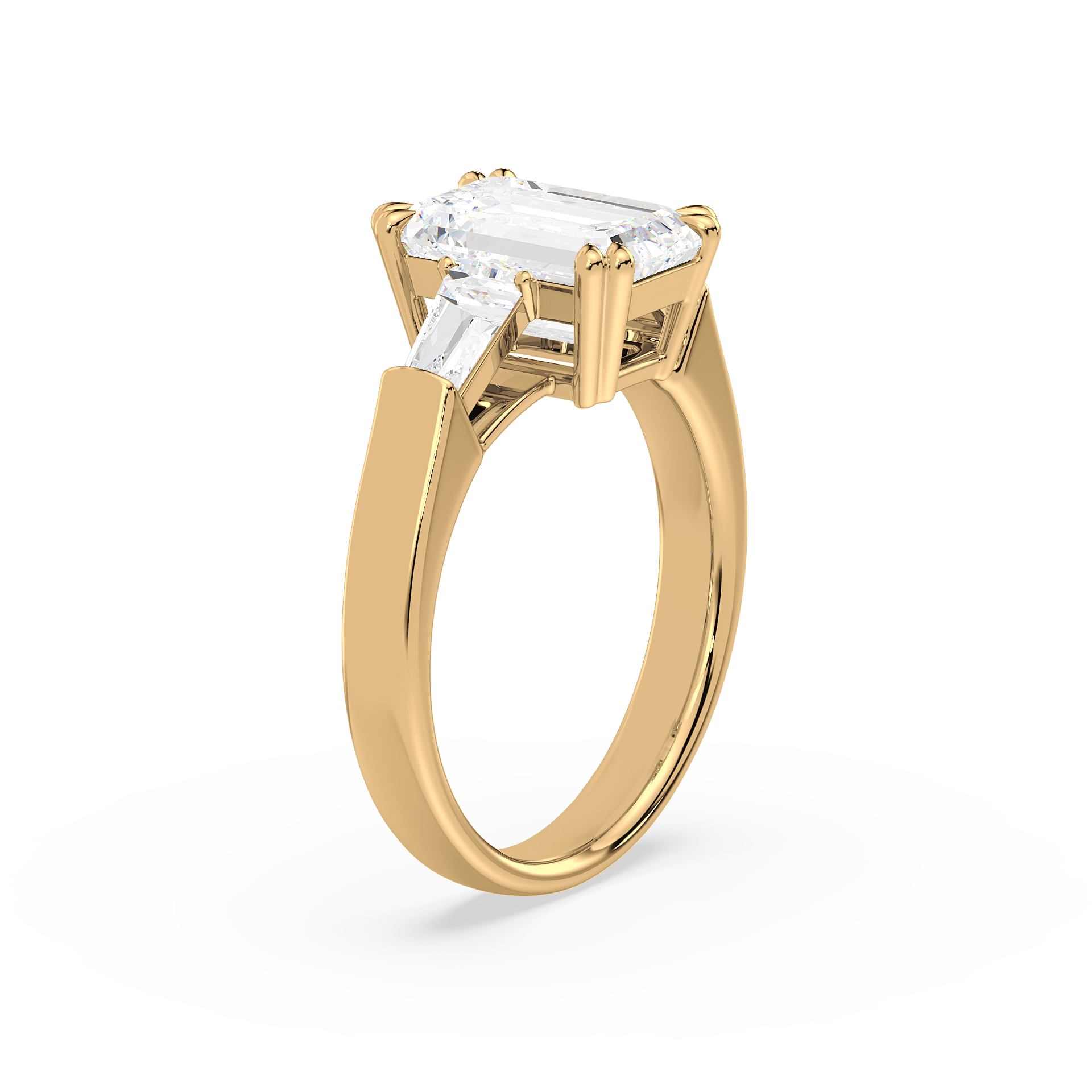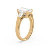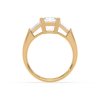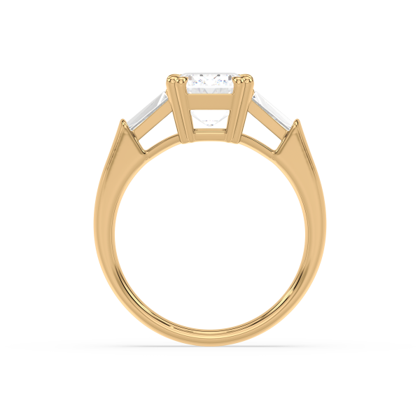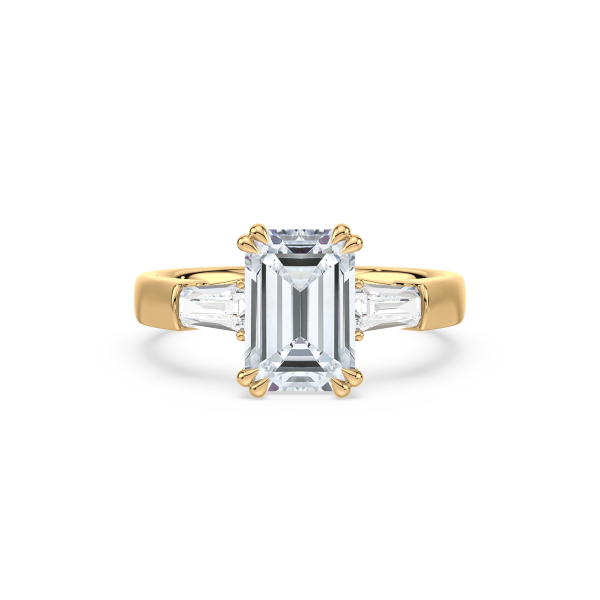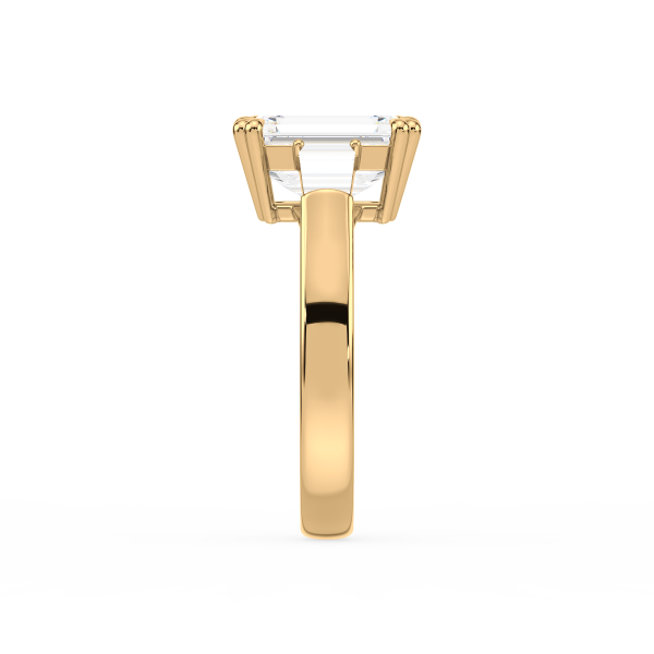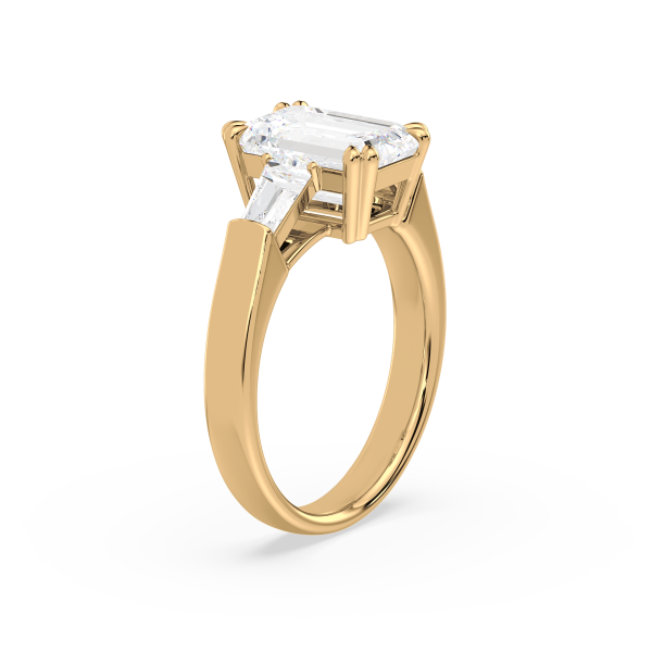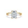 This sophisticated engagement ring features a striking emerald cut center diamond, flanked by tapered baguette side stones for a sleek, architectural look. Set in warm yellow gold, the clean lines and balanced proportions create a ring that is both modern and timeless. A perfect choice for those who appreciate understated glamour and enduring style.