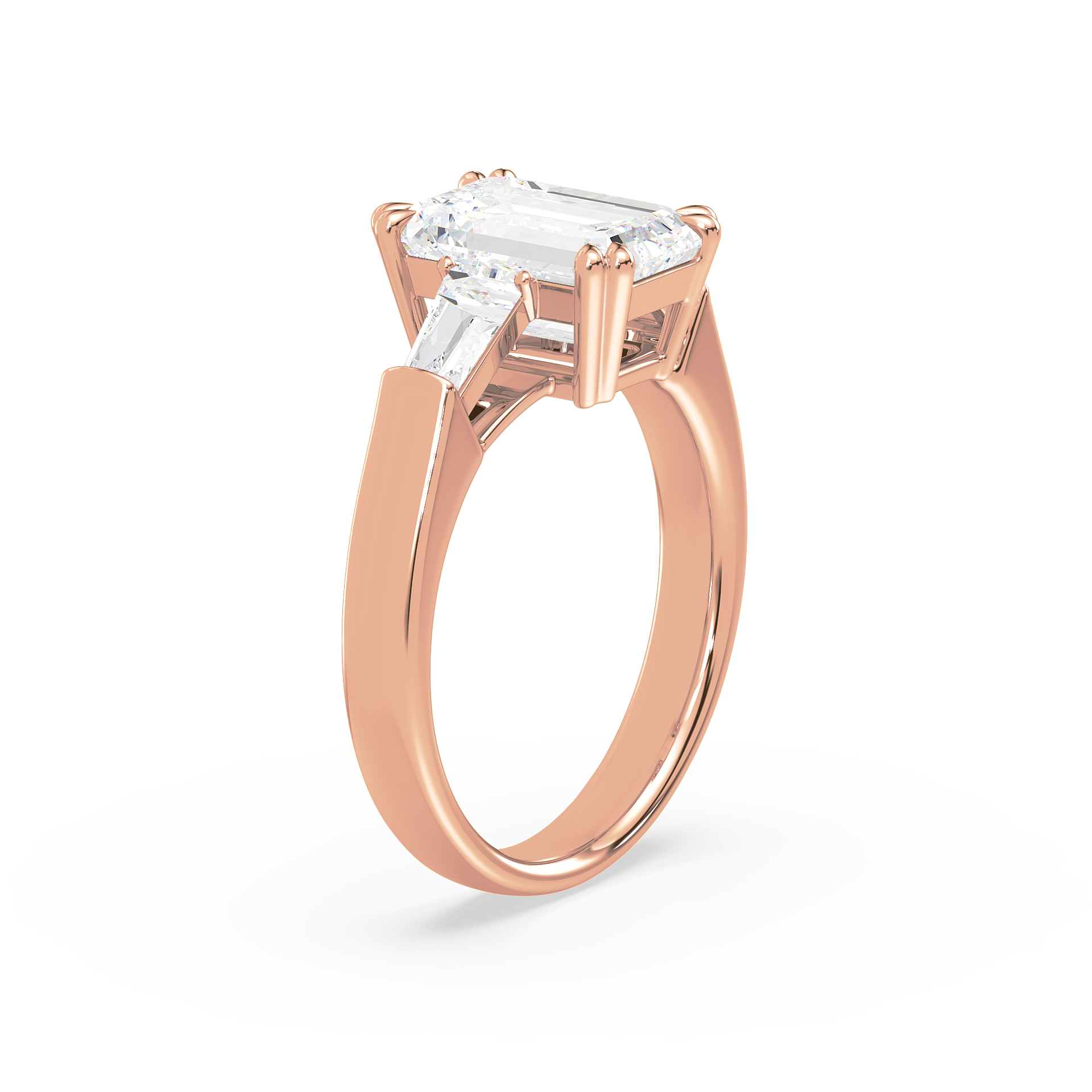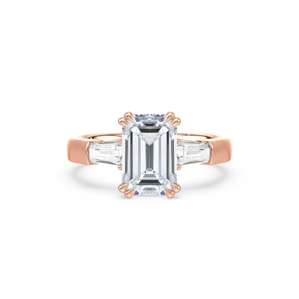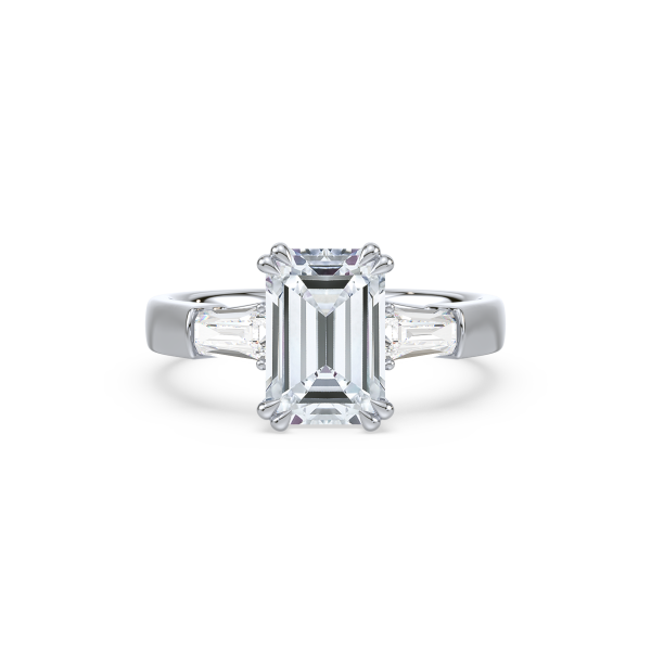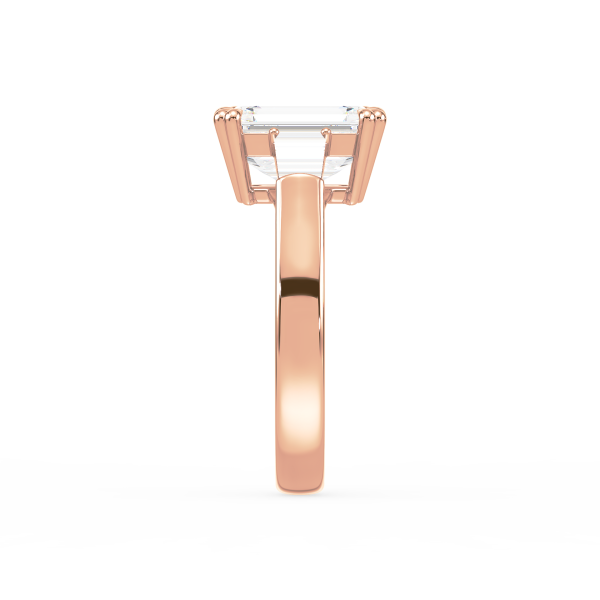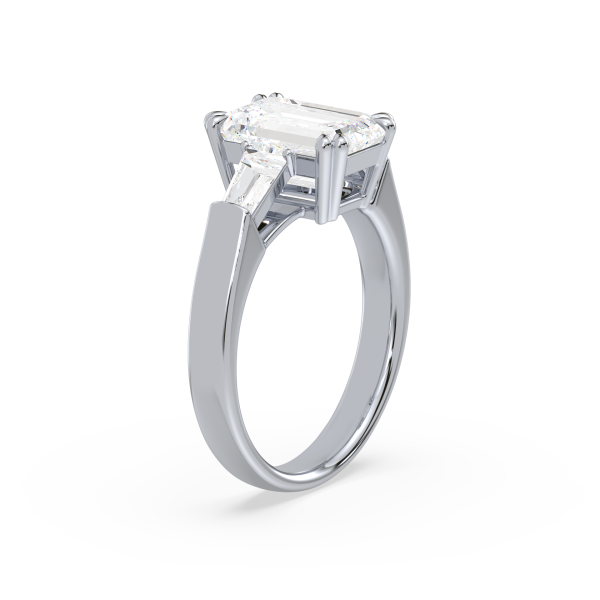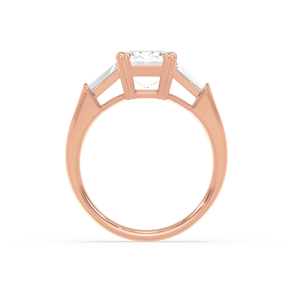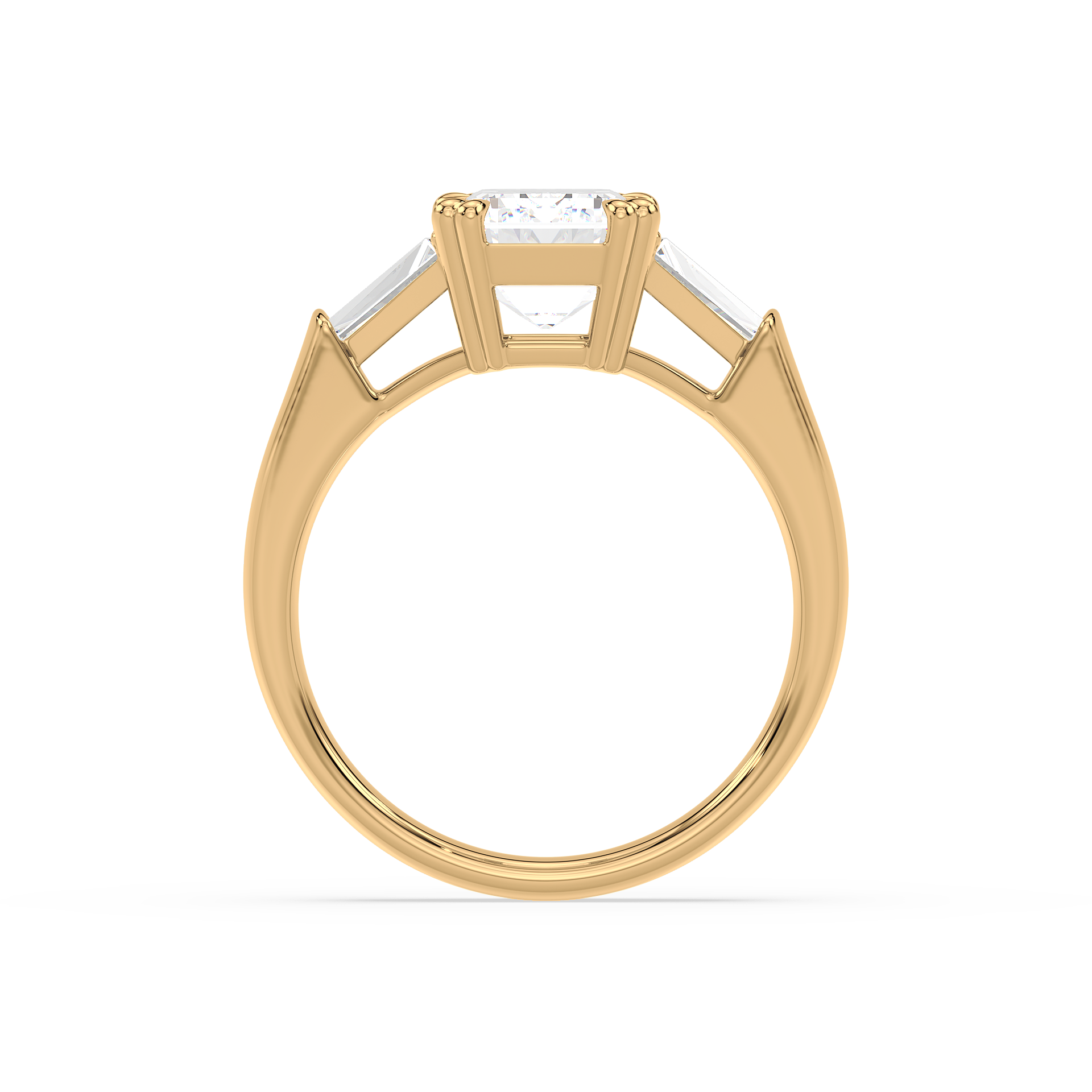 This sophisticated engagement ring features a striking emerald cut center diamond, flanked by tapered baguette side stones for a sleek, architectural look. Set in warm yellow gold, the clean lines and balanced proportions create a ring that is both modern and timeless. A perfect choice for those who appreciate understated glamour and enduring style.