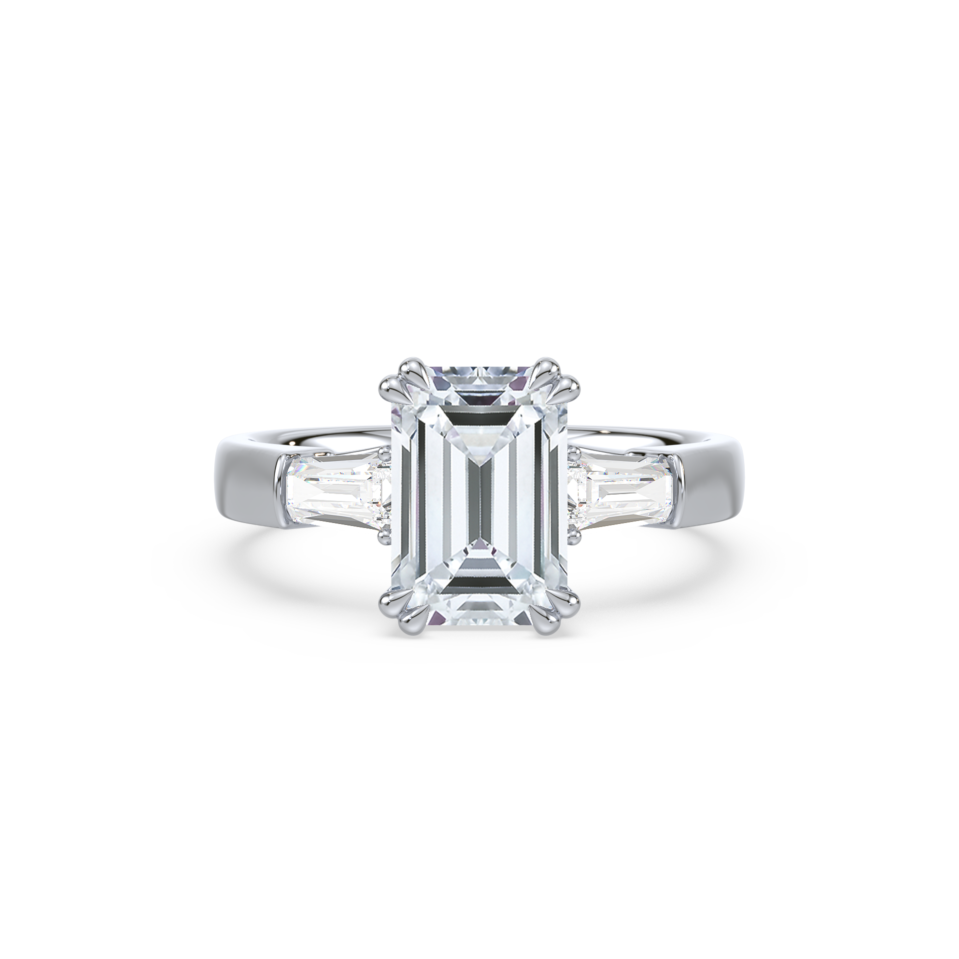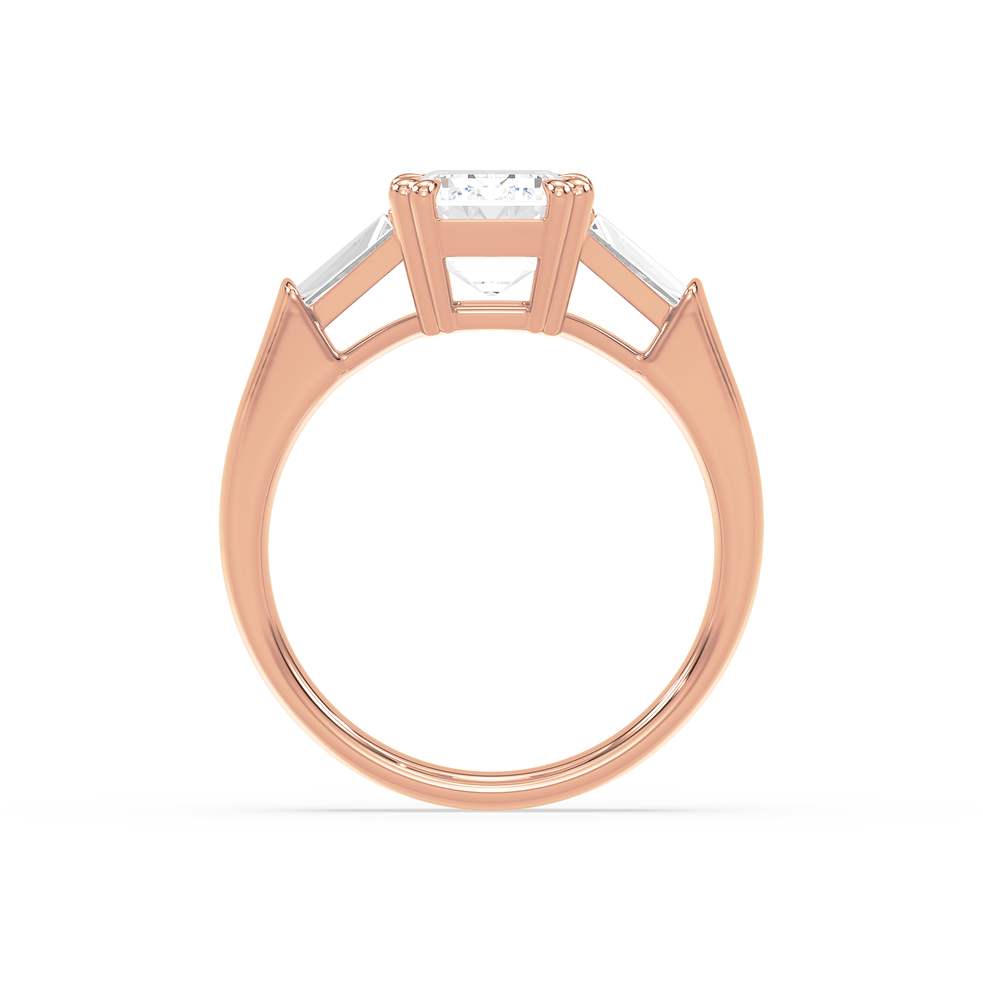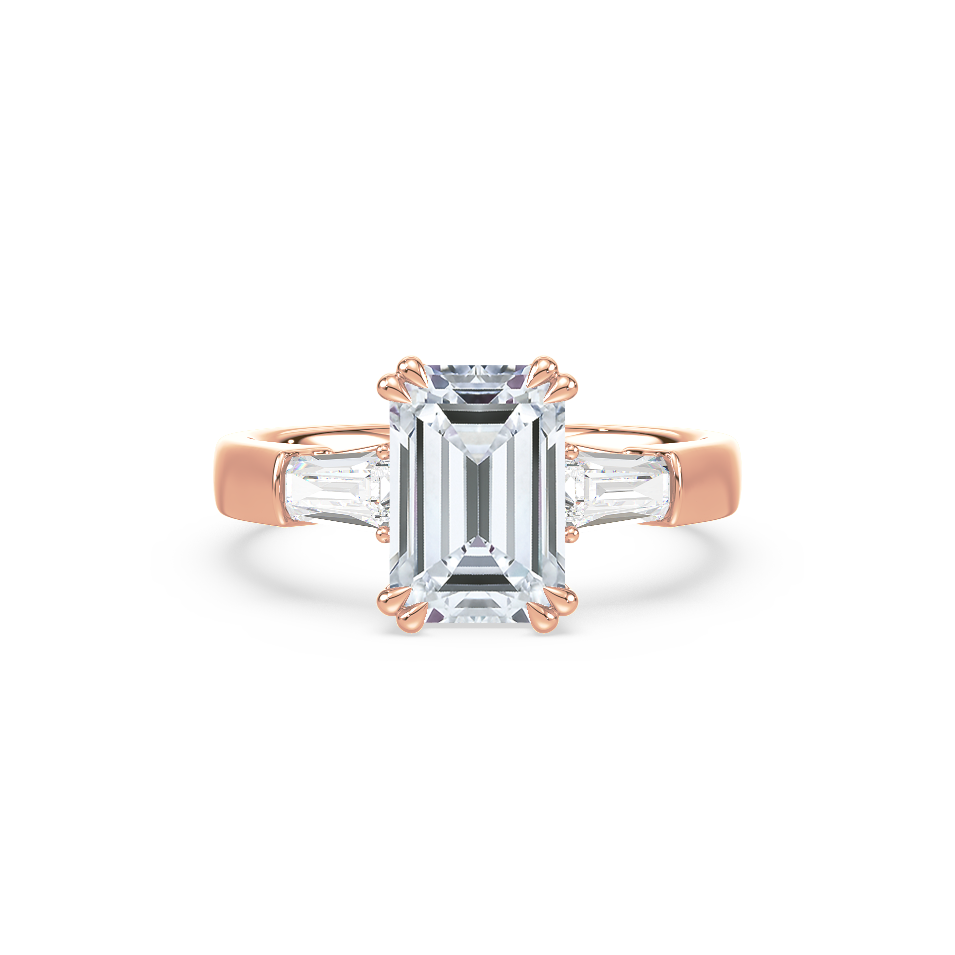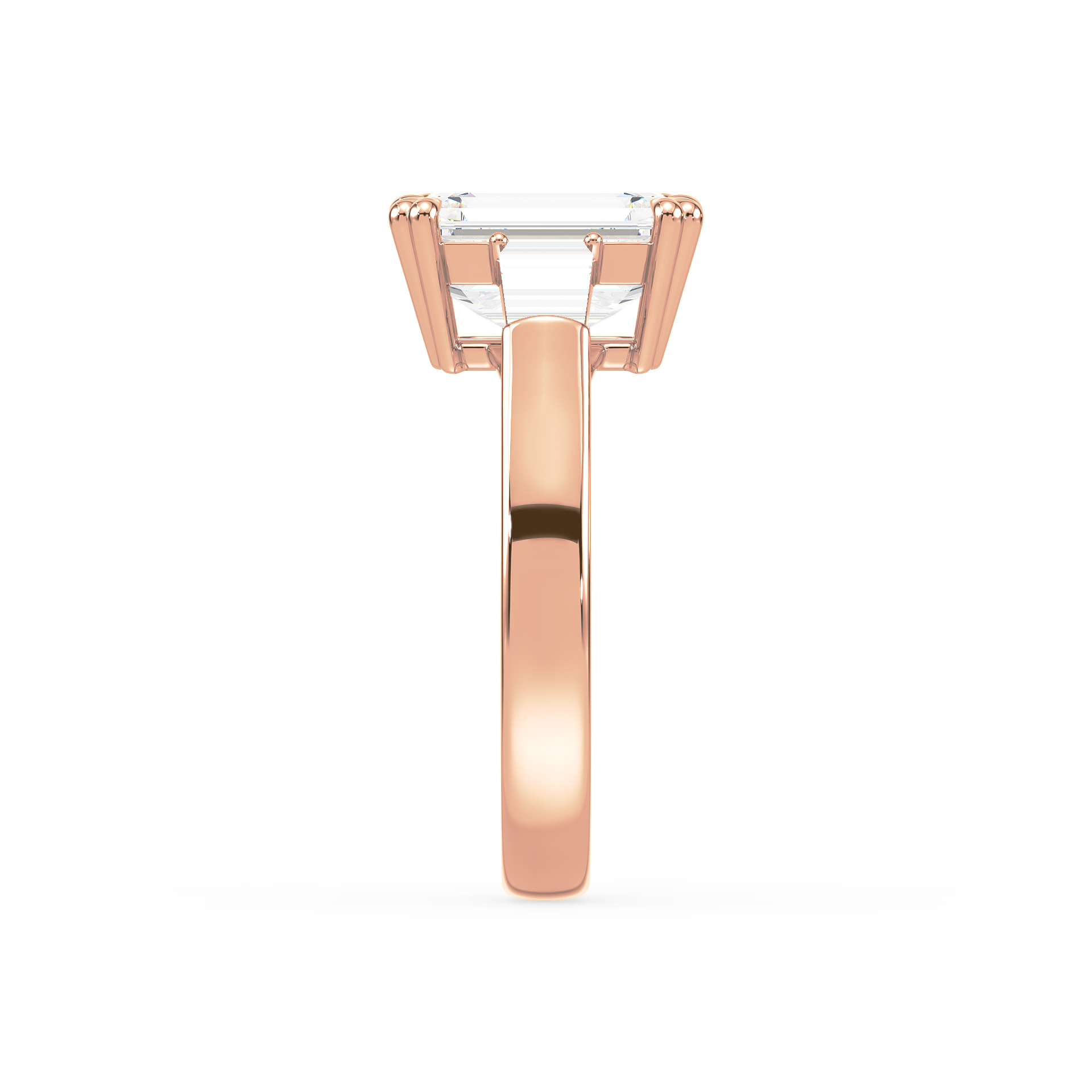 This sophisticated engagement ring features a striking emerald cut center diamond, flanked by tapered baguette side stones for a sleek, architectural look. Set in warm yellow gold, the clean lines and balanced proportions create a ring that is both modern and timeless. A perfect choice for those who appreciate understated glamour and enduring style.
