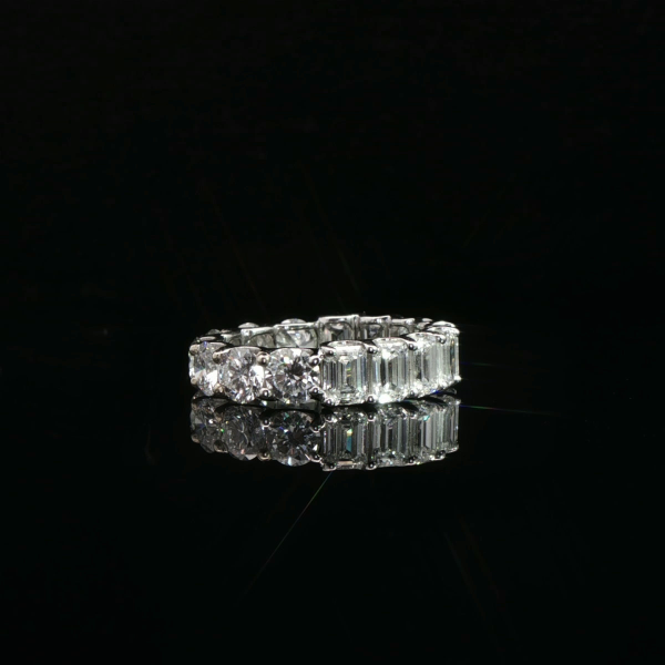 A sophisticated eternity band featuring a striking emerald-cut diamond frontage seamlessly transitioning into a half circle of brilliant round-cut and emerald diamonds.