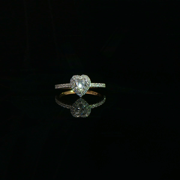 This romantic heart shape diamond ring features a sparkling heart solitaire set on a slim pavé diamond band in gold