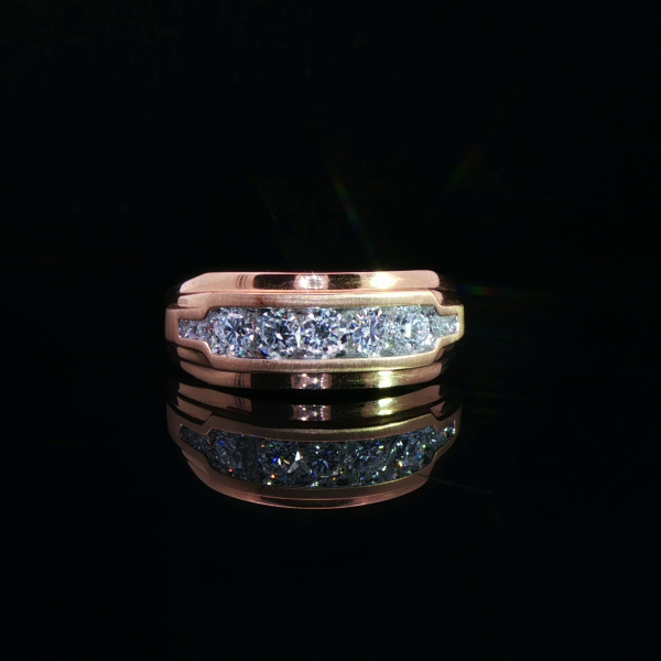 A refined men’s diamond band crafted in warm rose gold, featuring a sleek channel of brilliant diamonds for a powerful yet elegant statement.