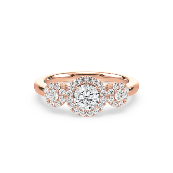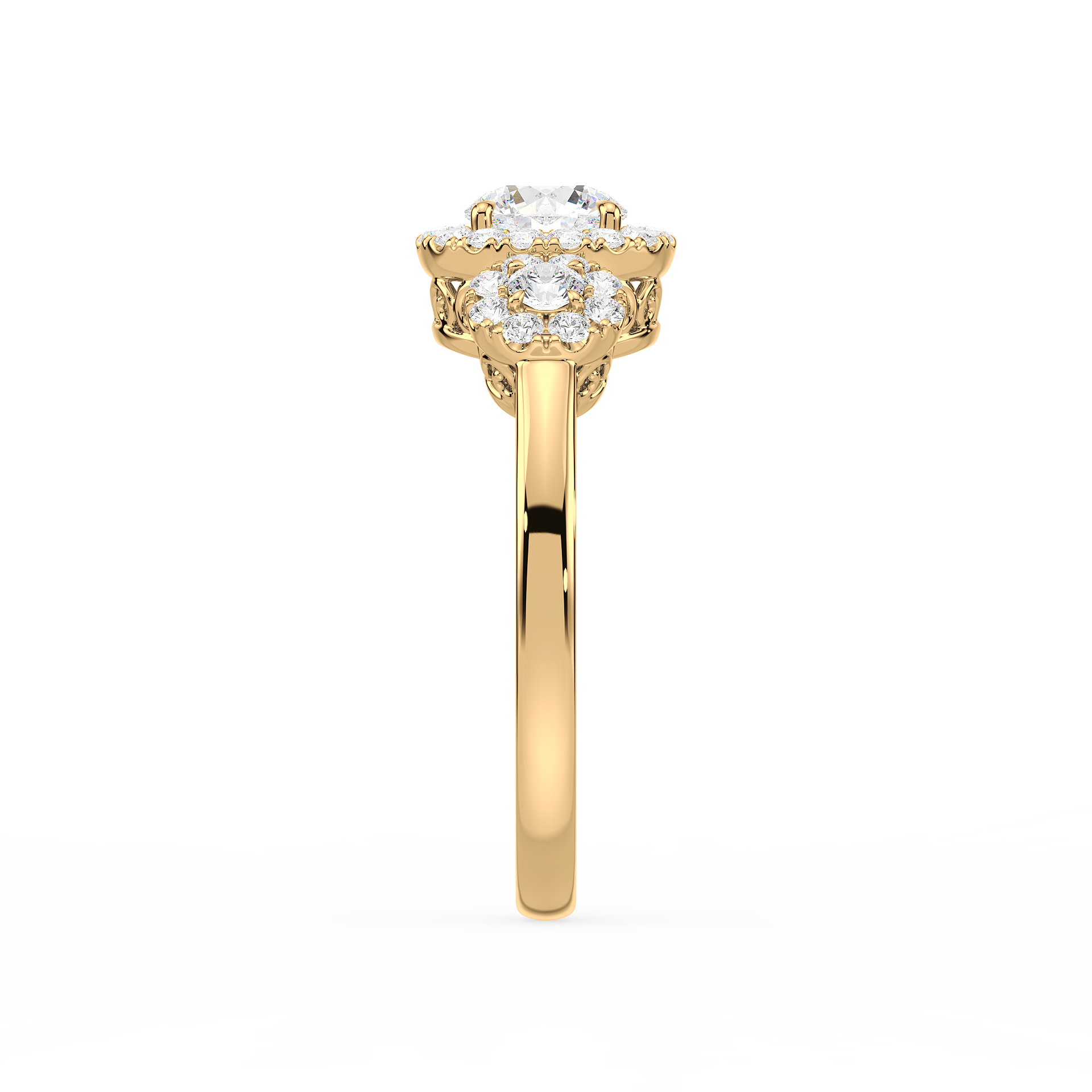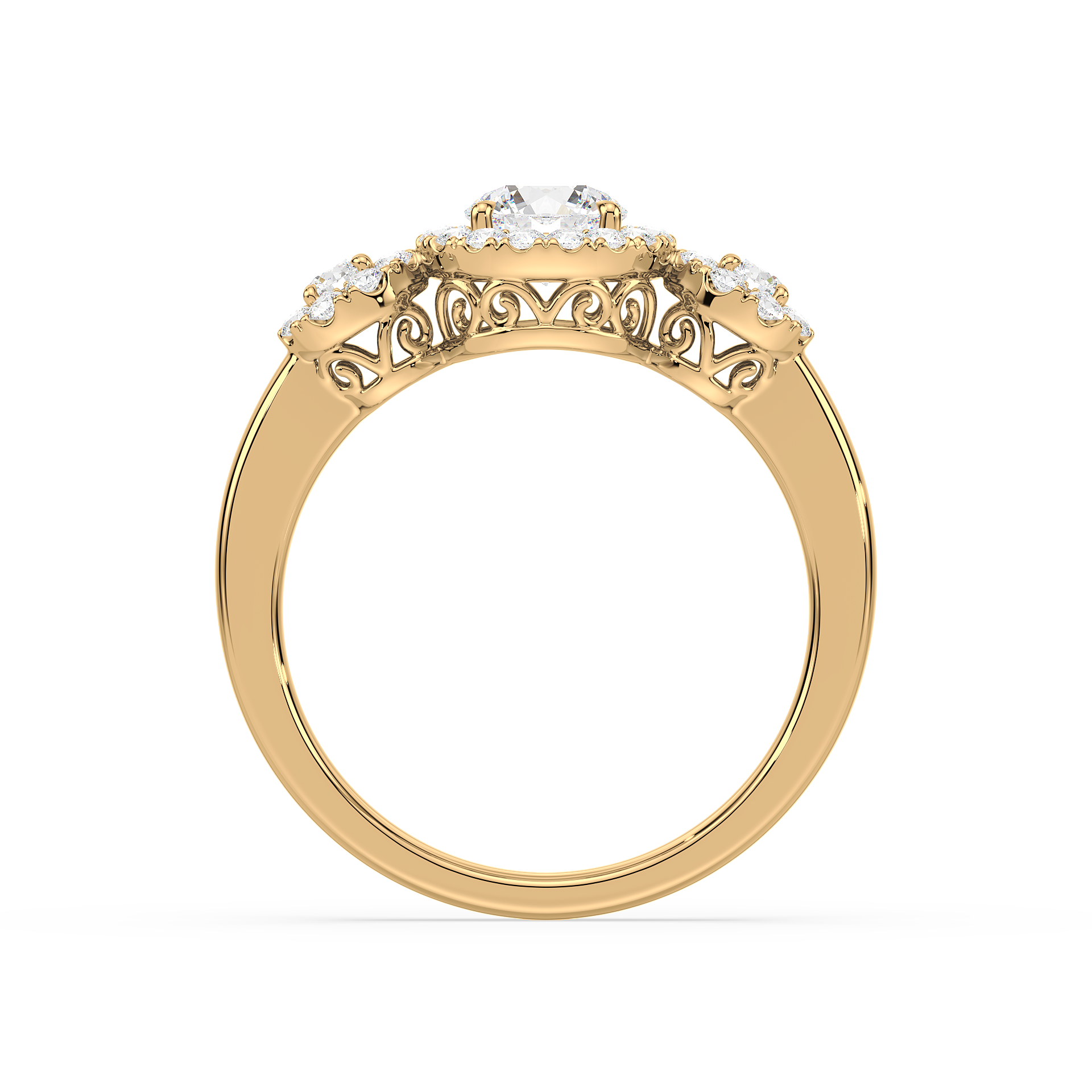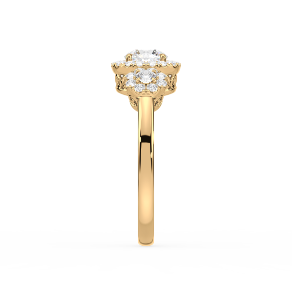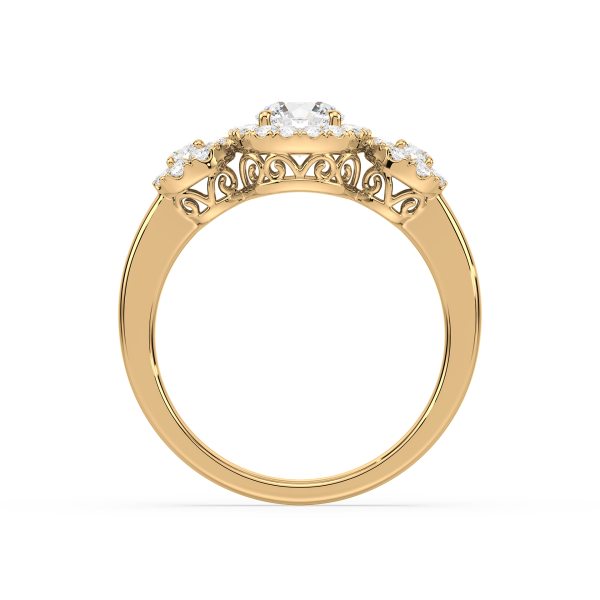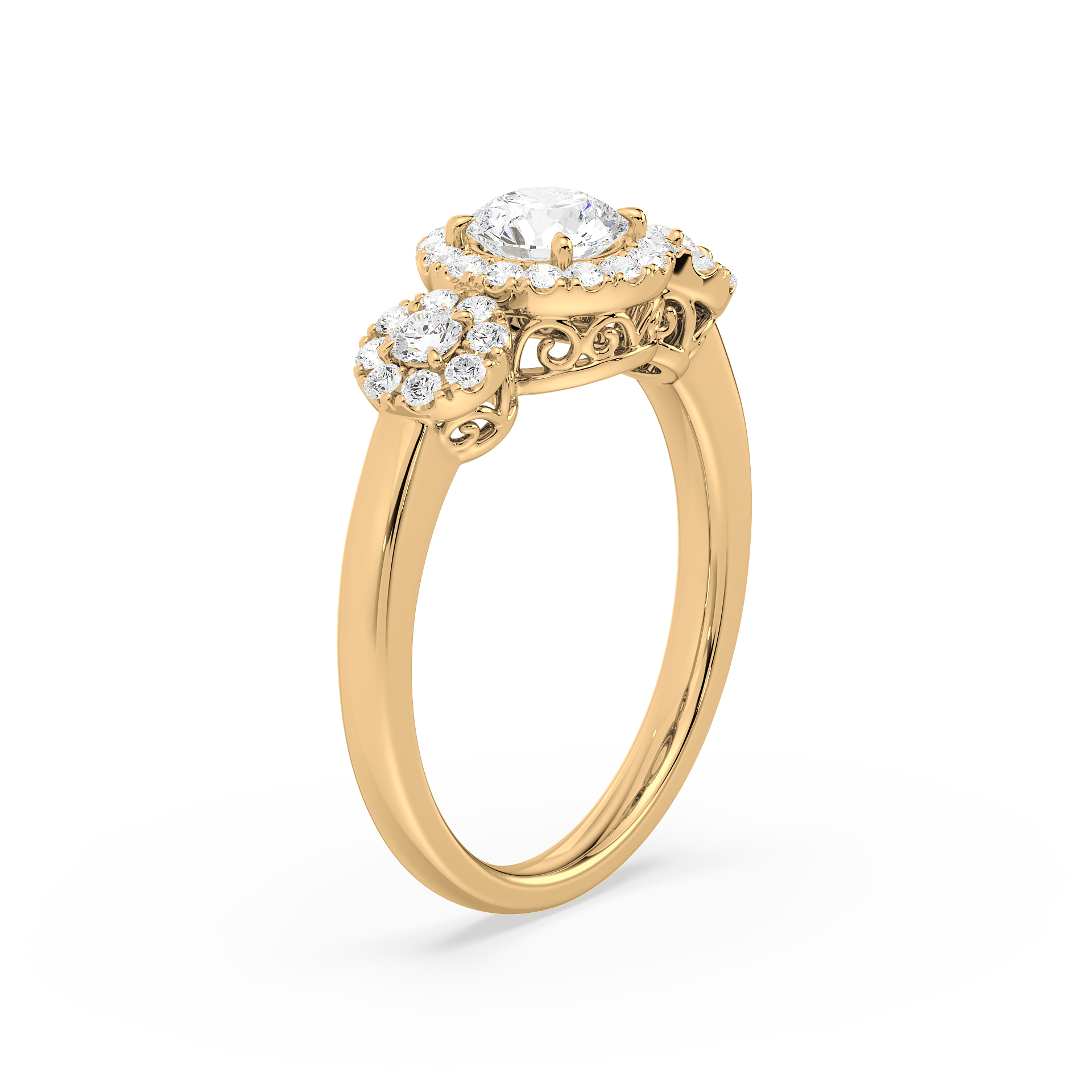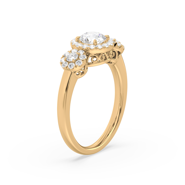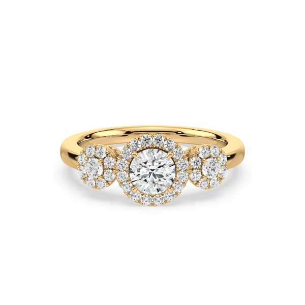 This dazzling ring showcases a round cut center diamond and two side stones, each embraced by a shimmering halo of pavé diamonds. The yellow gold band provides warmth and contrast, while the halo design maximizes brilliance, creating a breathtaking display of light and elegance.
