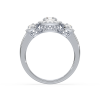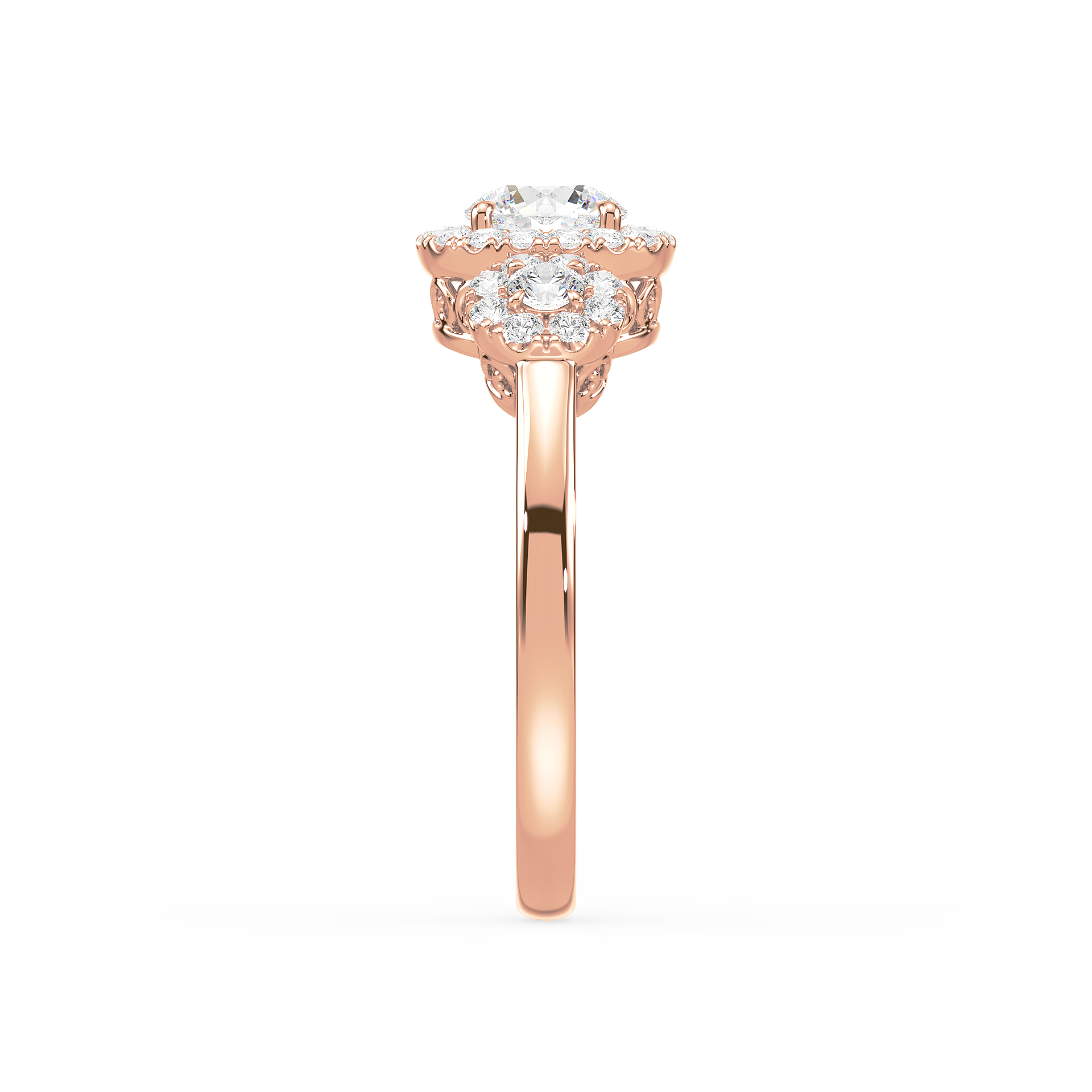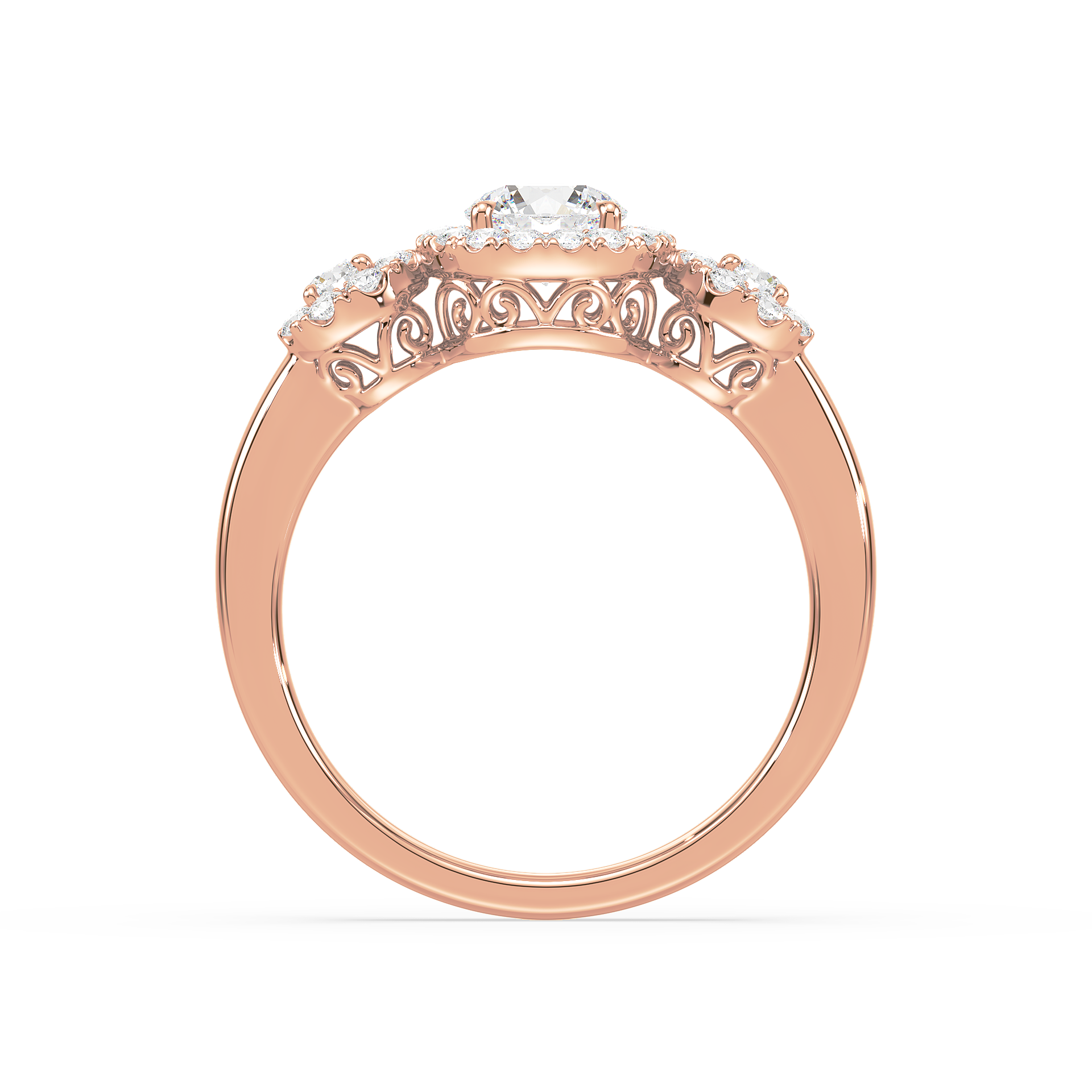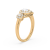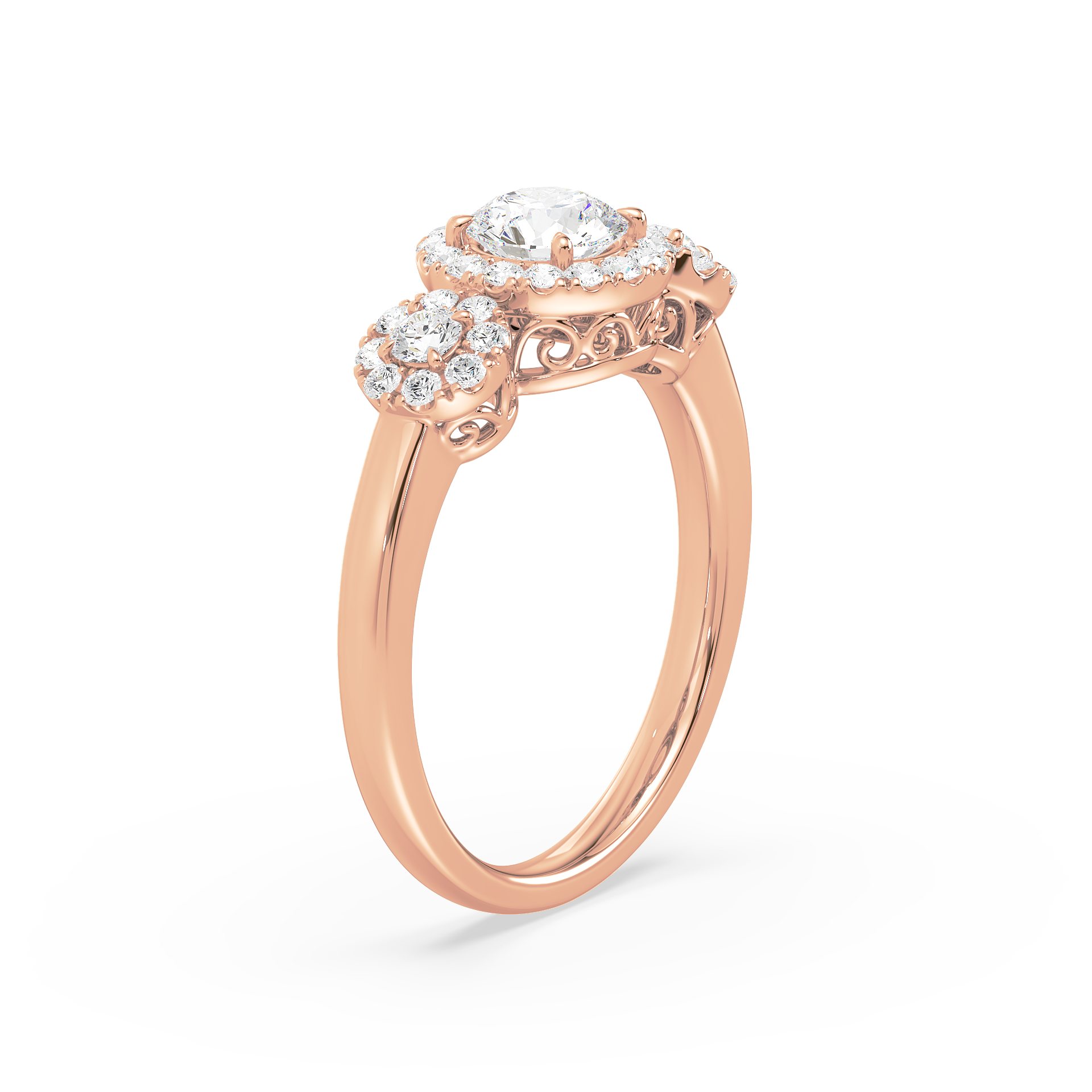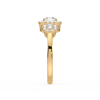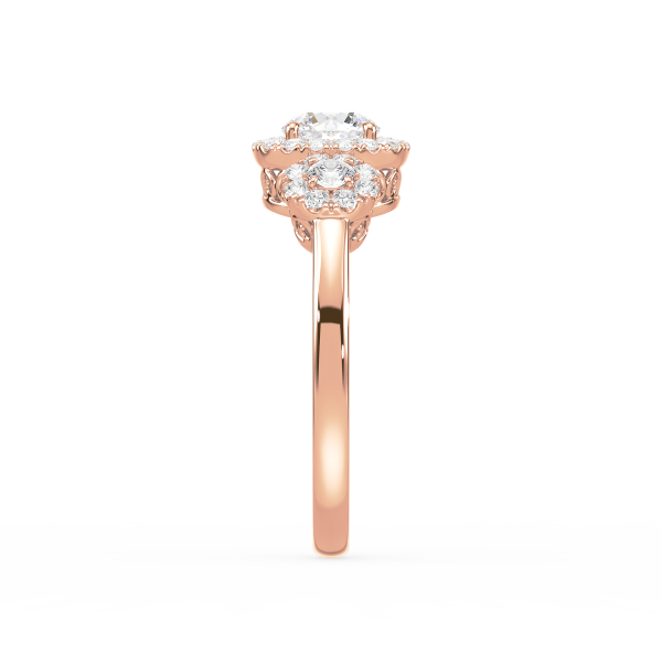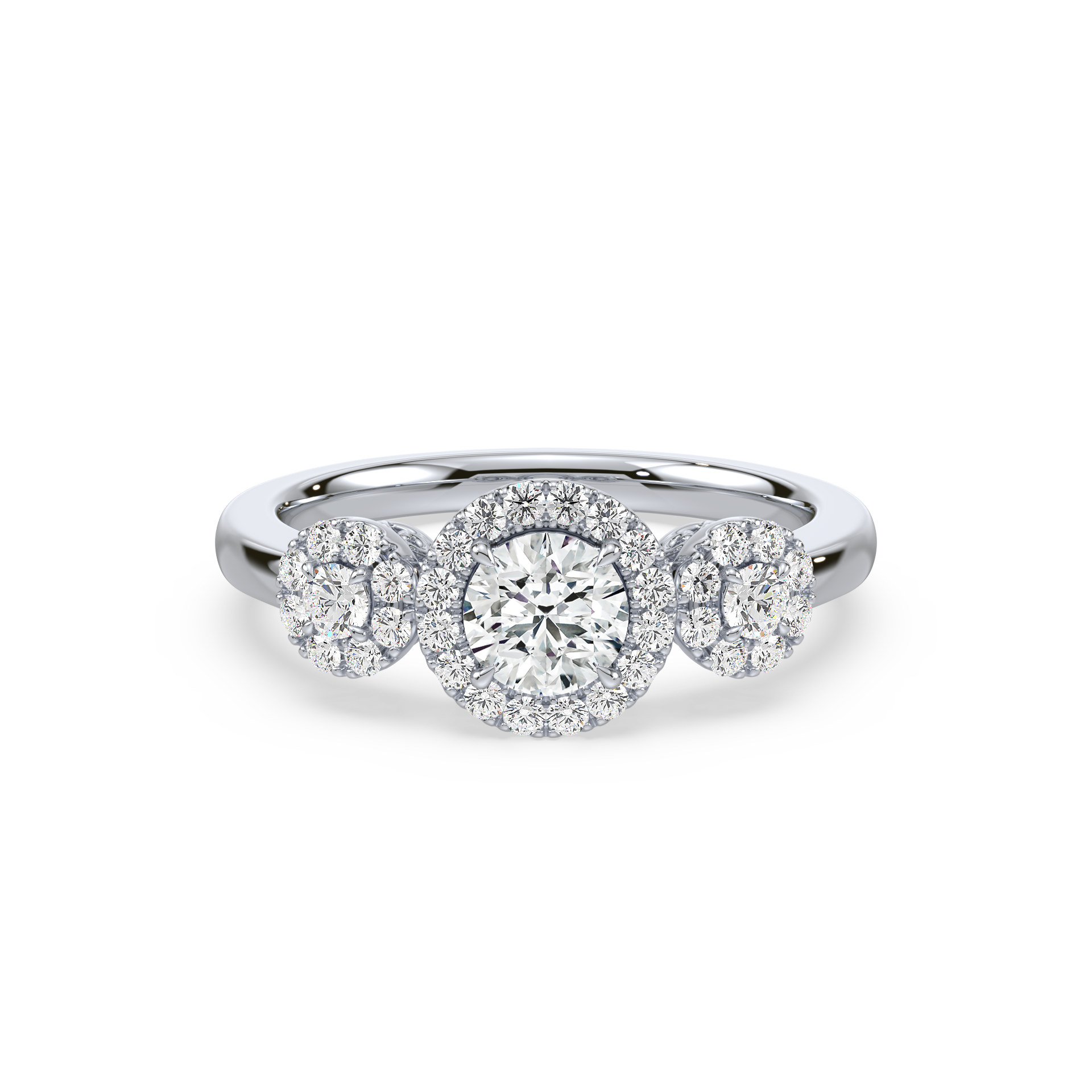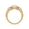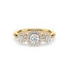 This dazzling ring showcases a round cut center diamond and two side stones, each embraced by a shimmering halo of pavé diamonds. The yellow gold band provides warmth and contrast, while the halo design maximizes brilliance, creating a breathtaking display of light and elegance.