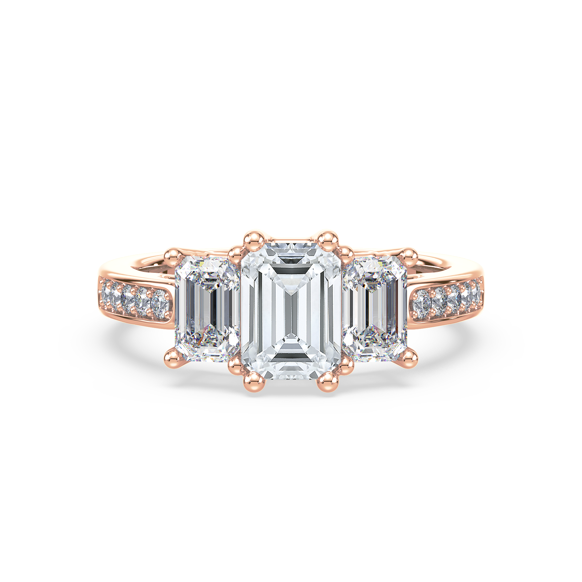 Set in lustrous yellow gold, this ring features a striking trio of emerald-cut lab-grown diamonds. The center stone is flanked by two slightly smaller emerald cuts, creating a balanced and timeless design. The band is adorned with pavé-set diamonds, adding extra brilliance and sophistication. A meaningful symbol of past, present, and future, this ring is a refined choice for engagements, anniversaries, or life’s most important milestones.