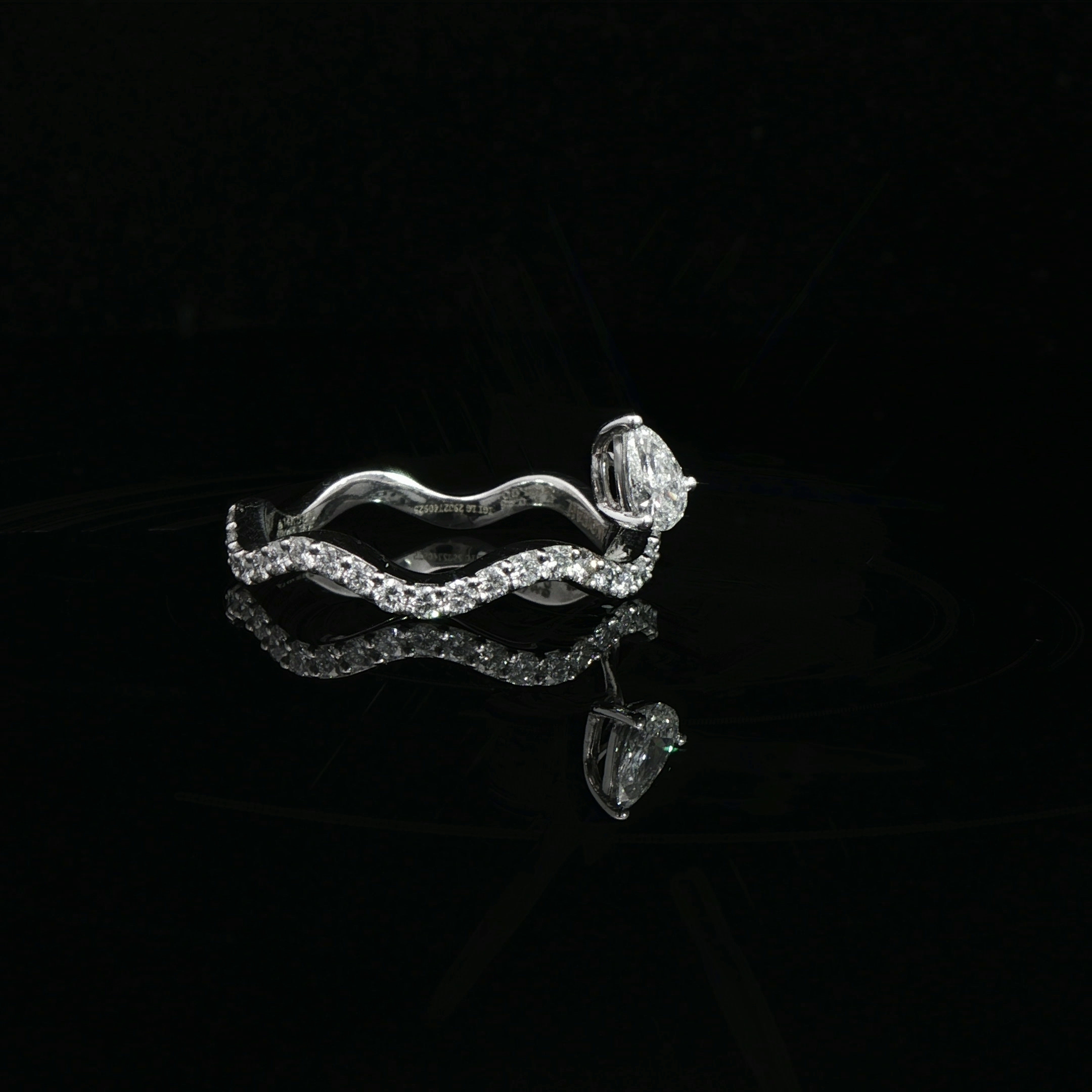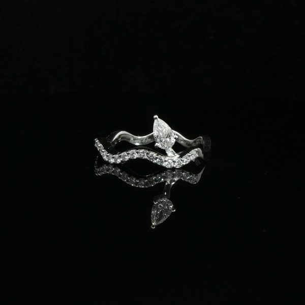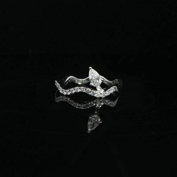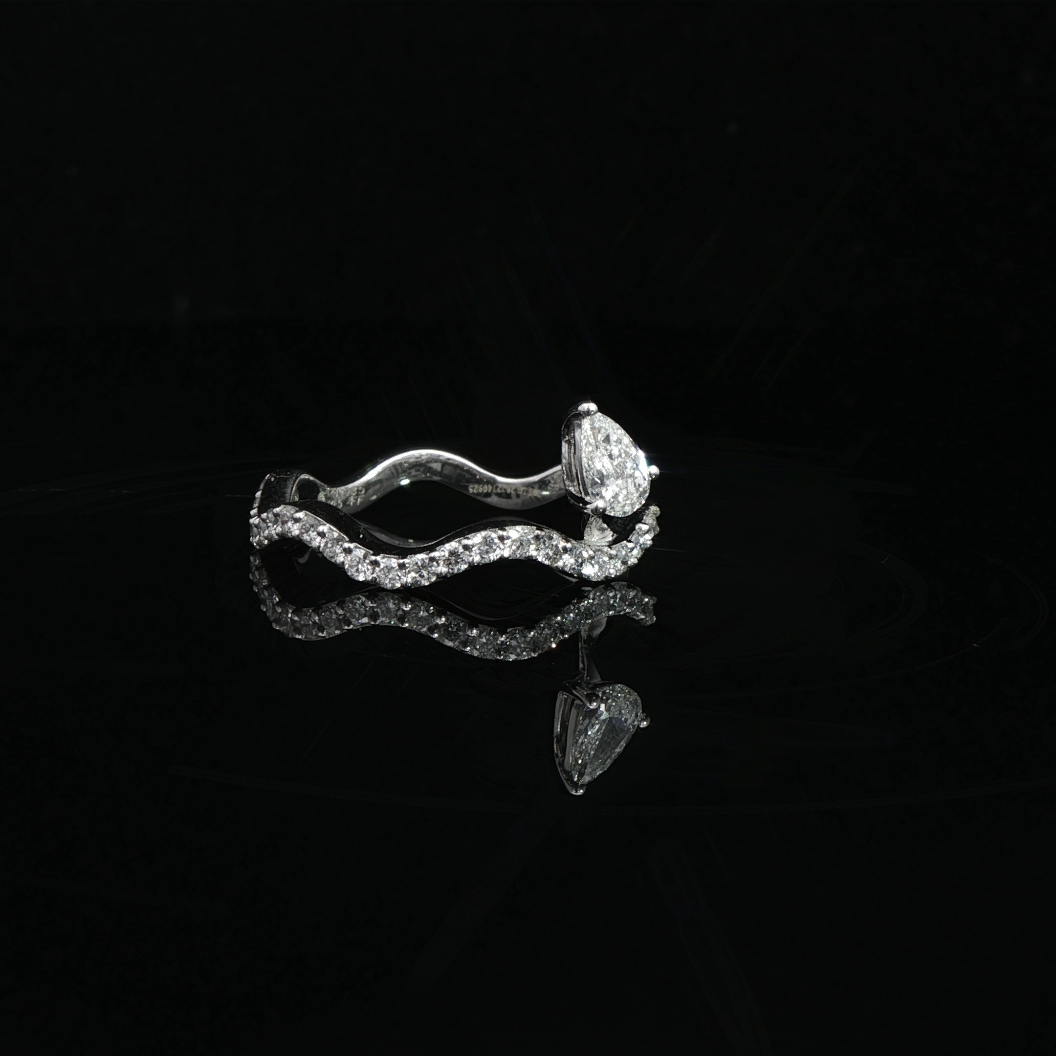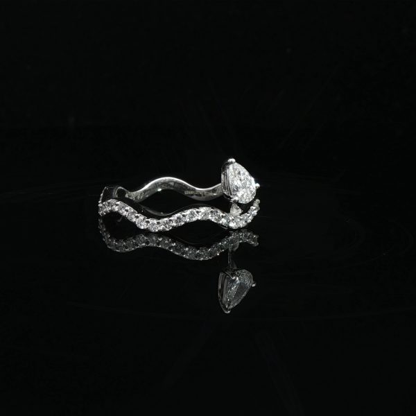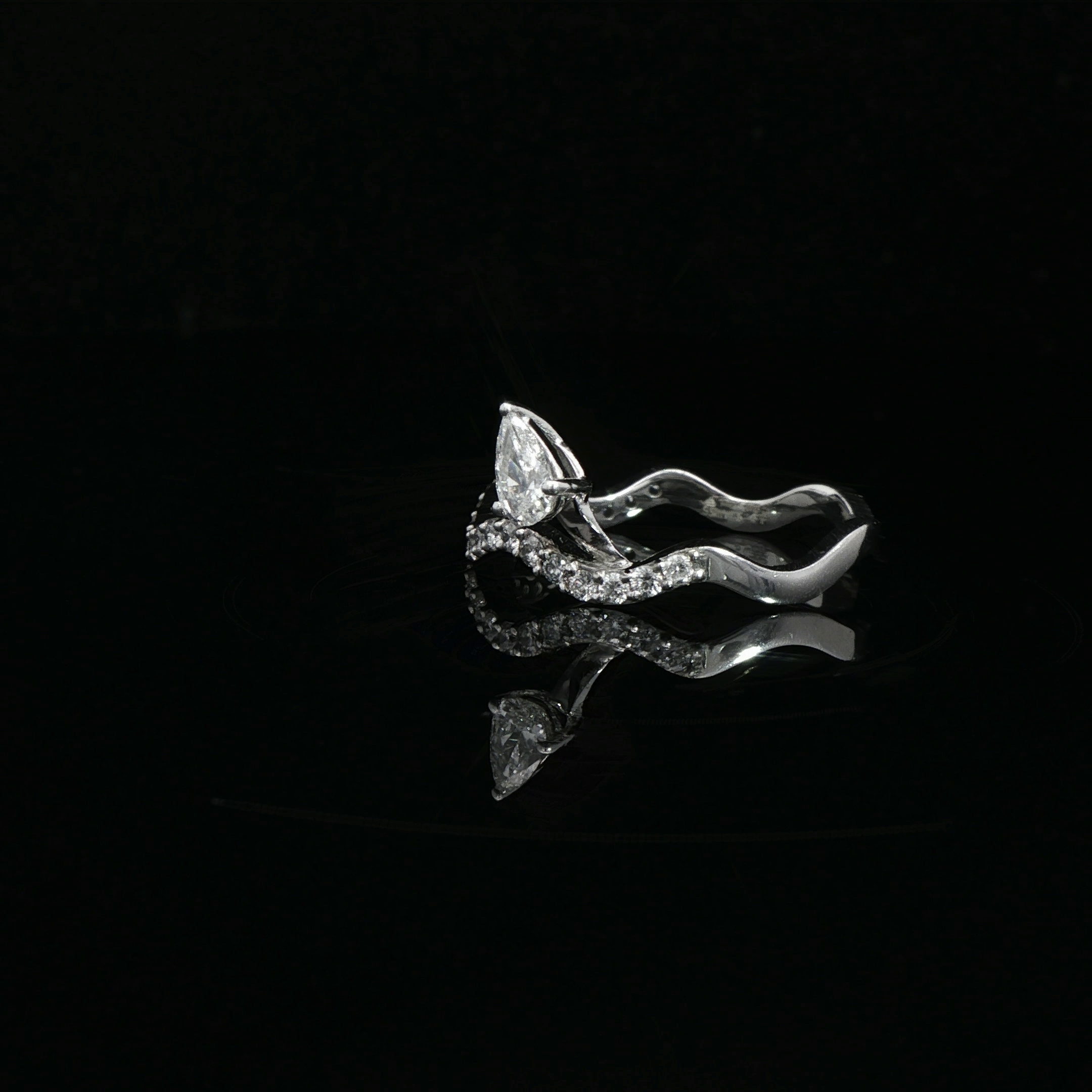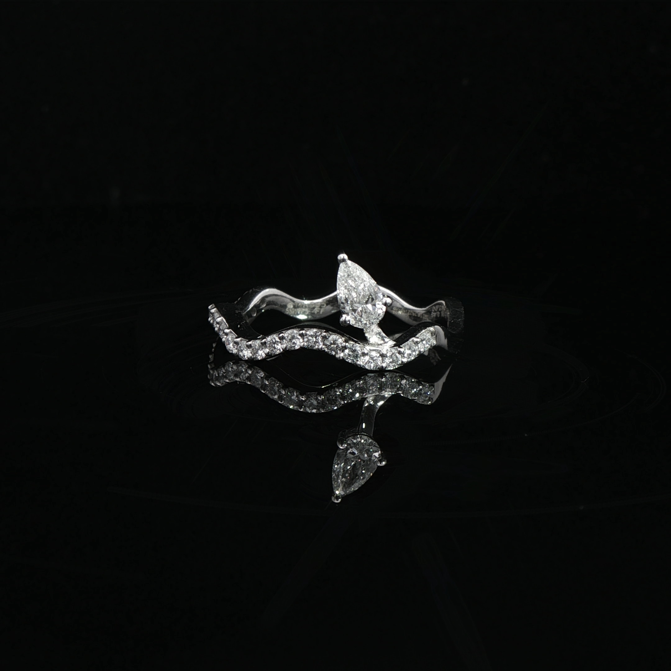 Exquisite stackable rings crafted in platinum and white gold. The design showcases a brilliant-cut pear-shaped diamond, exuding exceptional sparkle and fire. A perfect blend of contemporary style and timeless elegance, these rings add a touch of sophistication to any ensemble.
