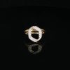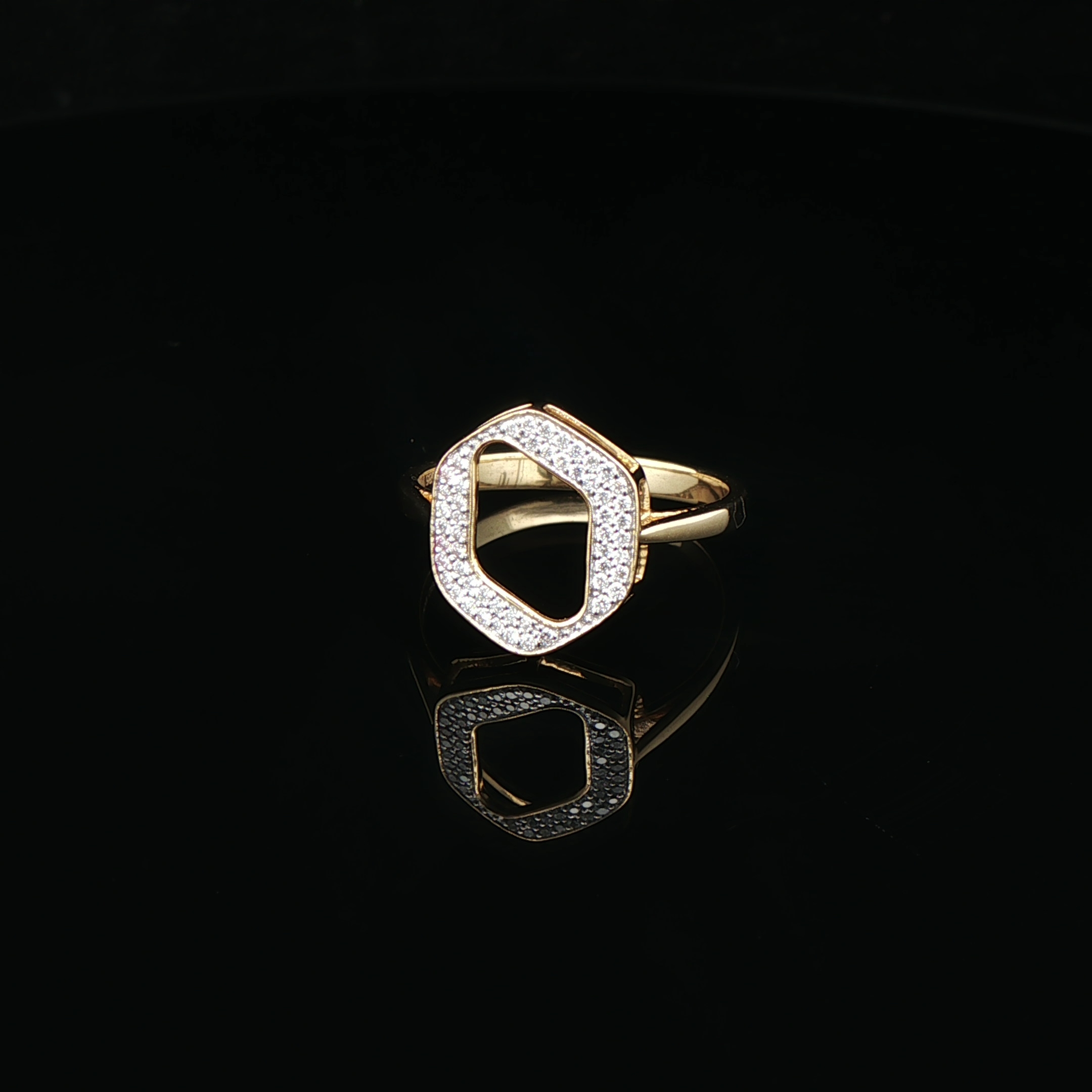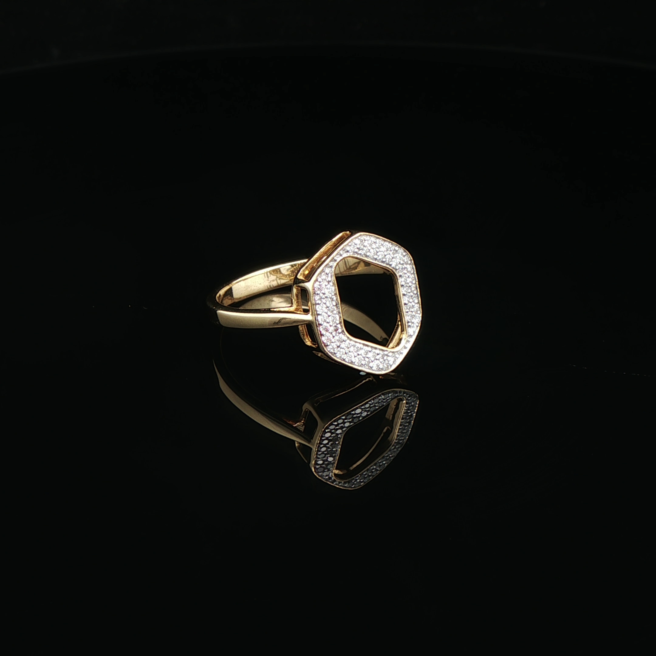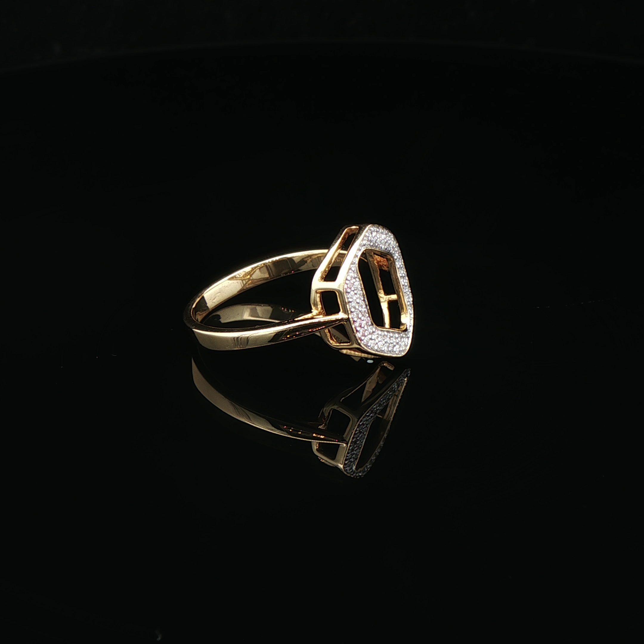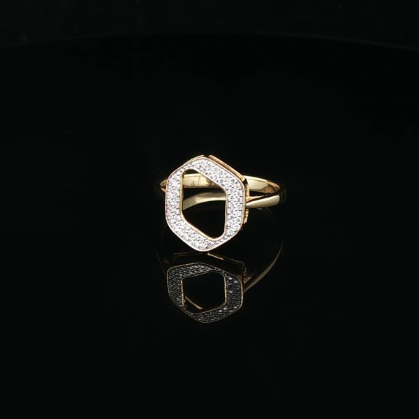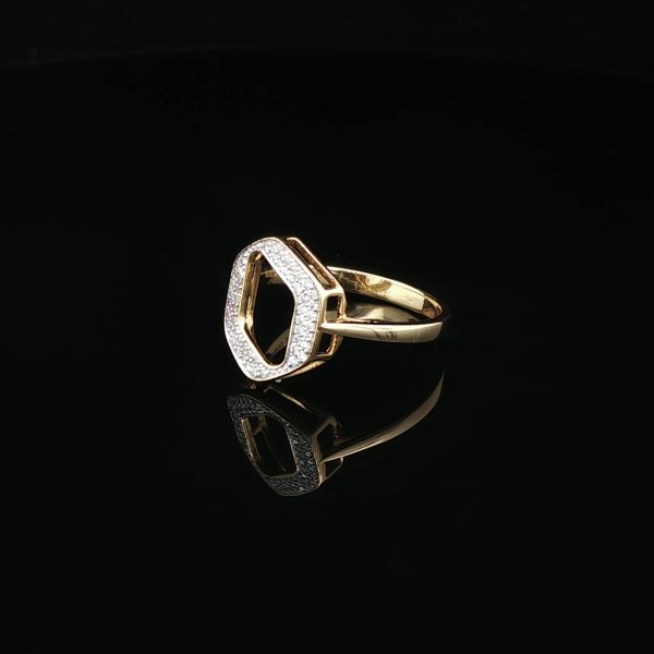 Elevate your ensemble with this exquisite yellow gold cocktail ring. The ring features a geometric design adorned with round cut diamonds set in a pave setting, radiating timeless sophistication and glamour. This piece offers a seamless blend of modern aesthetics with classic refinement, making it a perfect statement for any occasion.